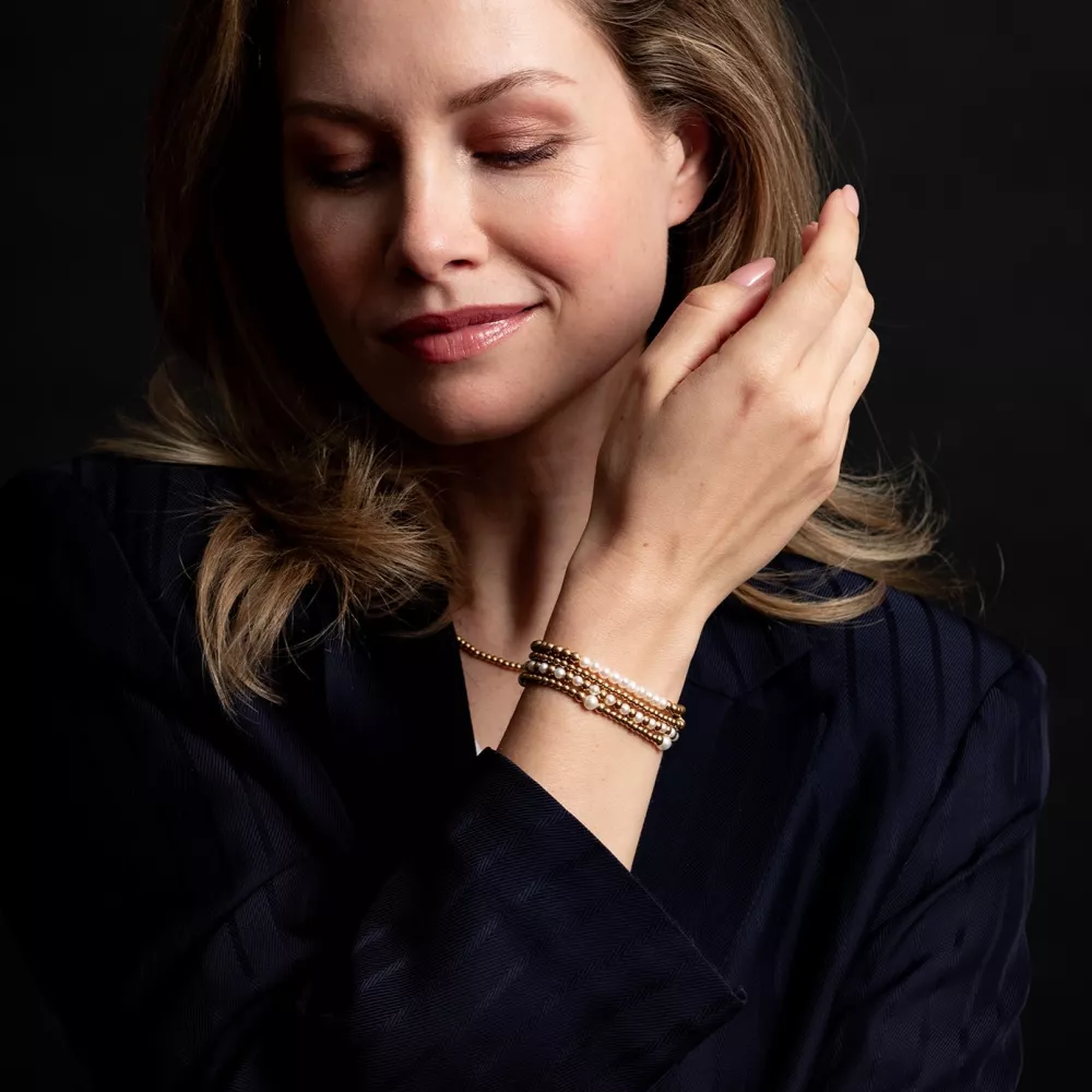 Edelstenen kralenarmband, handgemaakt van echte 4mm zoetwater parels van hoge kwaliteit, afgewisseld met 4mm 1goudkleurig ion-plated edelstalen stenen. De sluiting is gemaakt van goudkleurig ion-plated edelstalen.