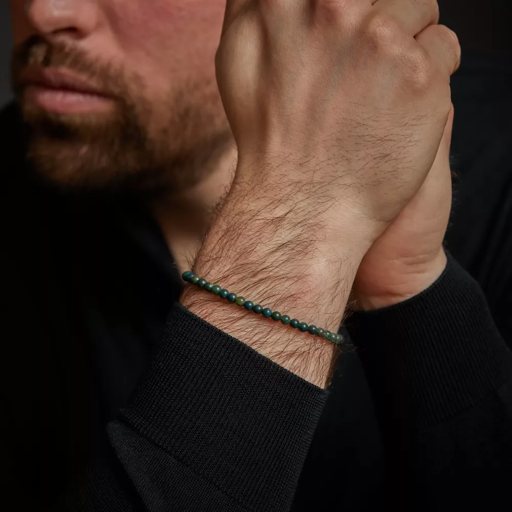Edelstenen kralenarmband, handgemaakt van 4mm Moss Agate stenen met een zilverkleurige sluiting.