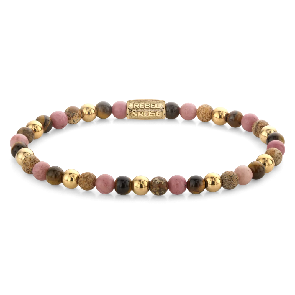 Edelstenen kralenarmband, handgemaakt van 4mm stenen (Tijgeroog, Rhodochrosiet en Bronziet) met een goldplated edelstalen sluiting.