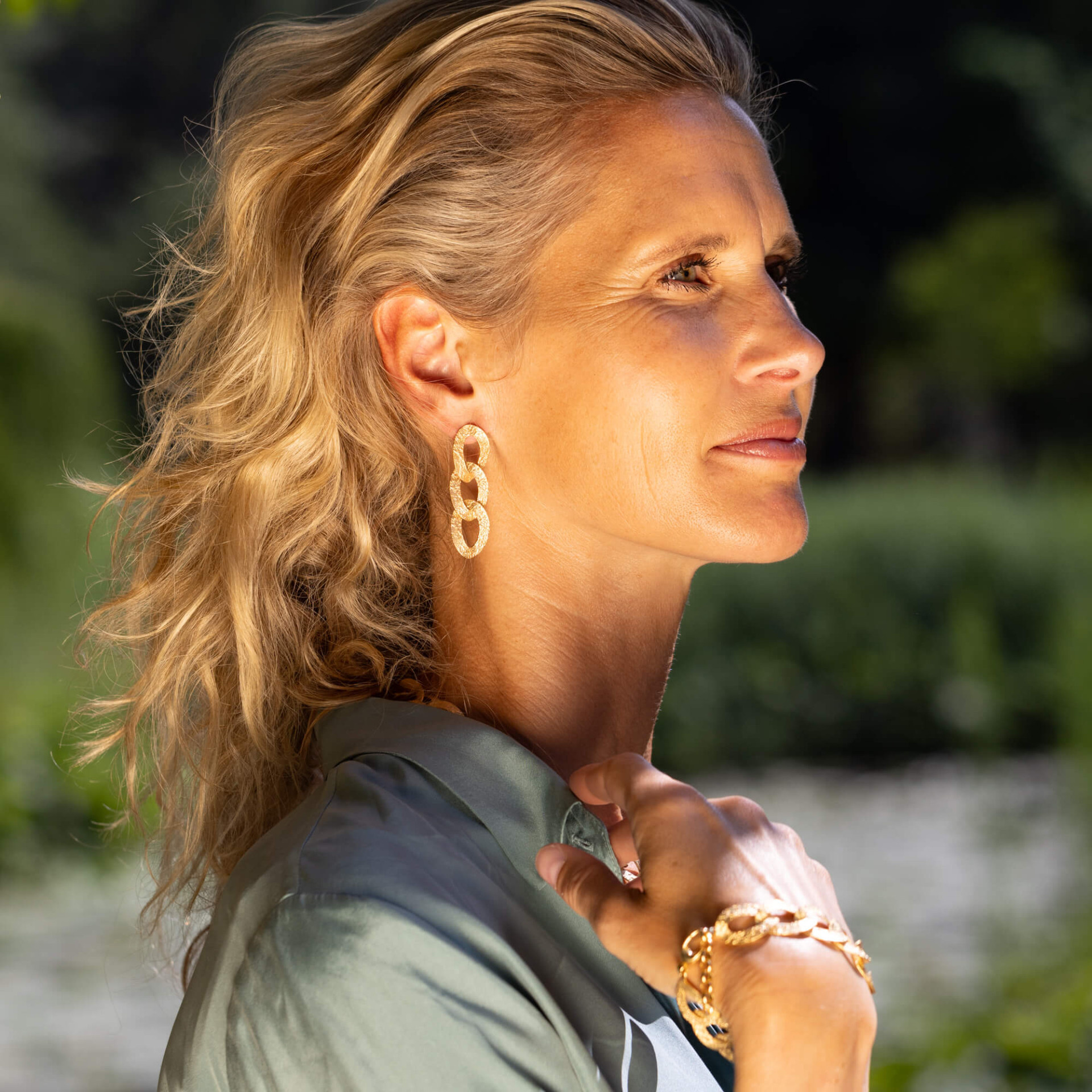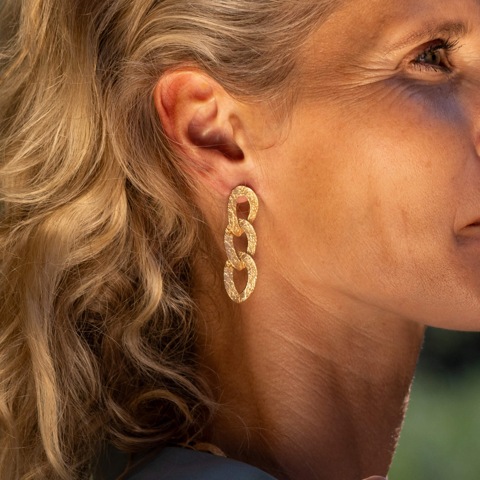 SANJOYA Oorbellen | SCHAKELOORBELLEN | LANG | VERGULD zijn schitterende schakeloorbellen van sterling zilver verguld, ovaalvormig met 3 open schakels. Mooi in combinatie met de bijpassende ketting en armband.