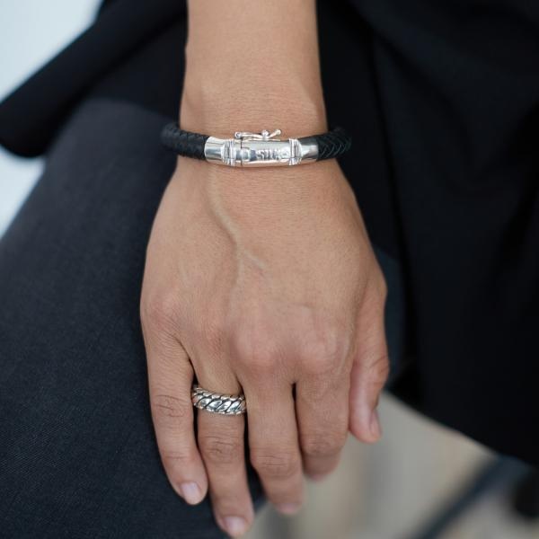 SILK Armband | 326BLK Armband is een stoere gevlochten leren armband in zwart gemixt leer voor zowel dames als heren. De leren armband sluit middels een mooi zilveren SILK slot. Deze armband is in meerdere kleuren verkrijgbaar; zwart. bruin, zwartbruin en olijf. Deze armbanden kunnen goed gecombineerd worden met een van de zilveren armbanden uit onze collectie. De armband wordt in een mooie luxe geschenkverpakking verpakt.