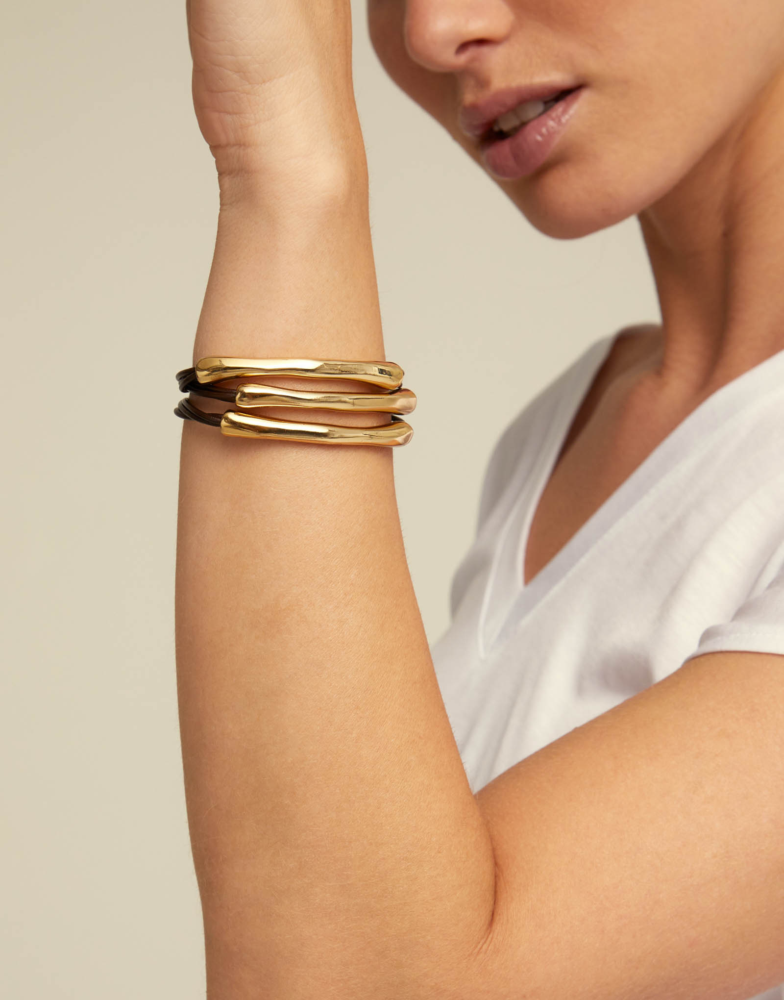 UNOde50 Armband NOT TO BE is een stoere unisex triple turn armband met bruin leren basis en vergulde buisvormige details.