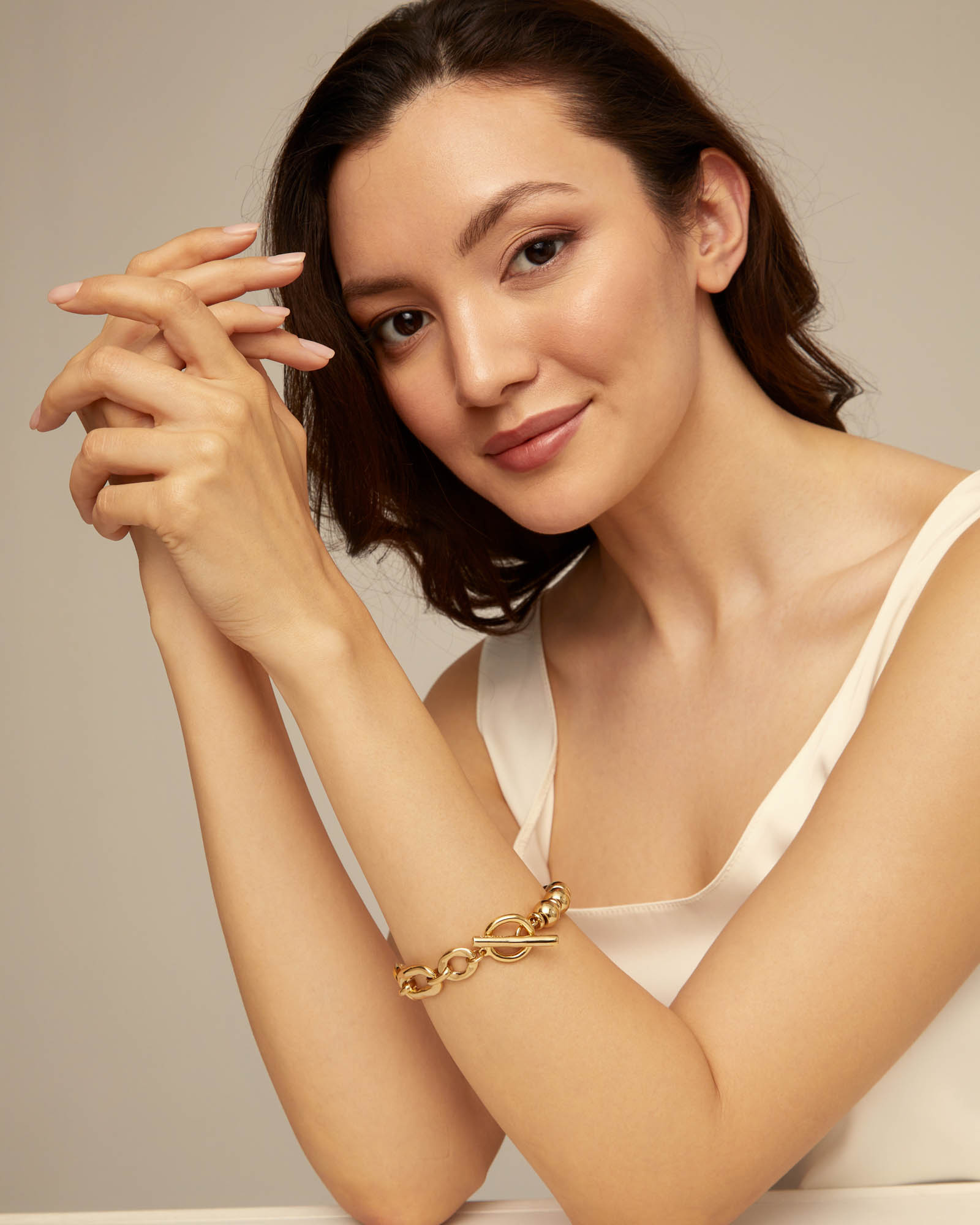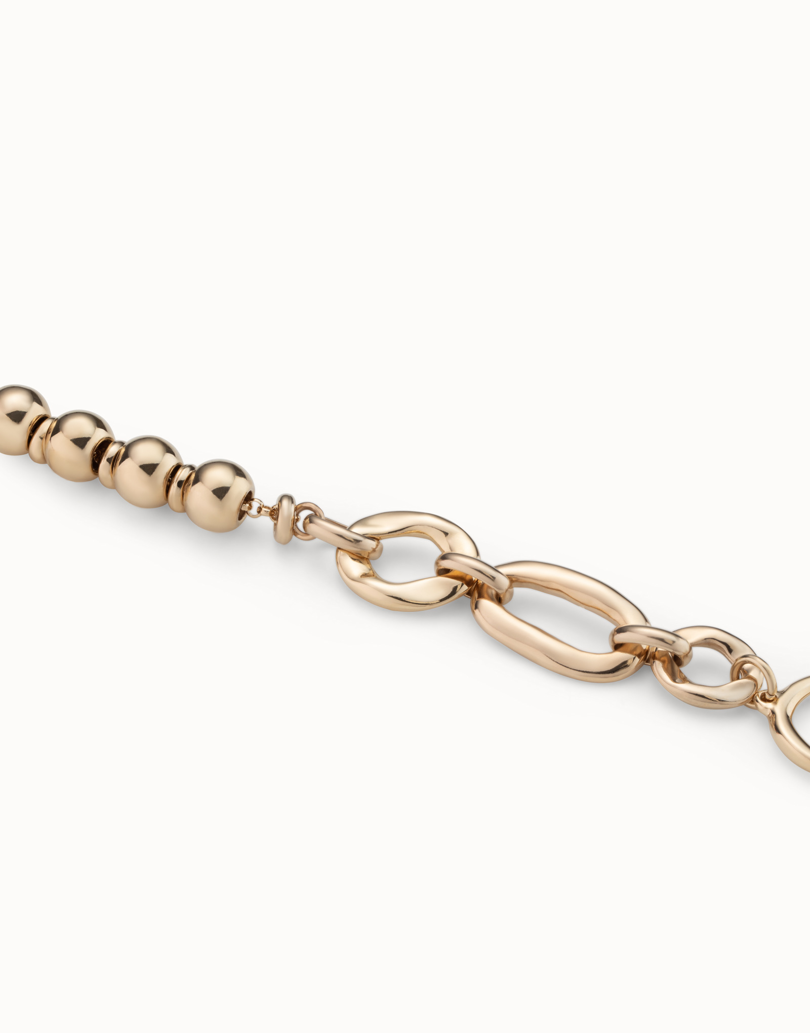 VERGULDE ARMBAND MET KRALEN EN SCHAKELSLUITING ||De JOYFUL-collectie combineert verschillende vormen en stijlen. Hierdoor kunnen we mixen en spelen, creatief zijn en genieten van elke stap die we zetten. Creativiteit belichaamd in sieraden zoals deze armband die kralen en schakelsluiting combineert, waardoor de armband in twee totaal verschillende helften wordt verdeeld en een origineel ontwerp ontstaat. De sluiting is een ring- en staafsluiting. |Dit juweel is gemaakt in Spanje, 100% handgemaakt en heeft een unieke designafwerking.
