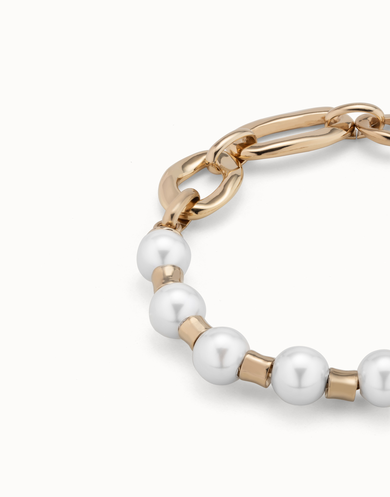 VERGULDE ARMBAND MET PARELS EN SCHAKELS ||De Joyful collectie combineert verschillende vormen en stijlen. Hierdoor kunnen we mixen en spelen, creatief zijn en genieten van elke stap die we zetten. Creativiteit belichaamd in sieraden zoals deze armband die parels en schakels combineert, de armband in twee totaal verschillende helften verdeelt en een origineel ontwerp creëert. ||Dit juweel is gemaakt in Spanje, 100% handgemaakt en heeft een unieke designafwerking.
