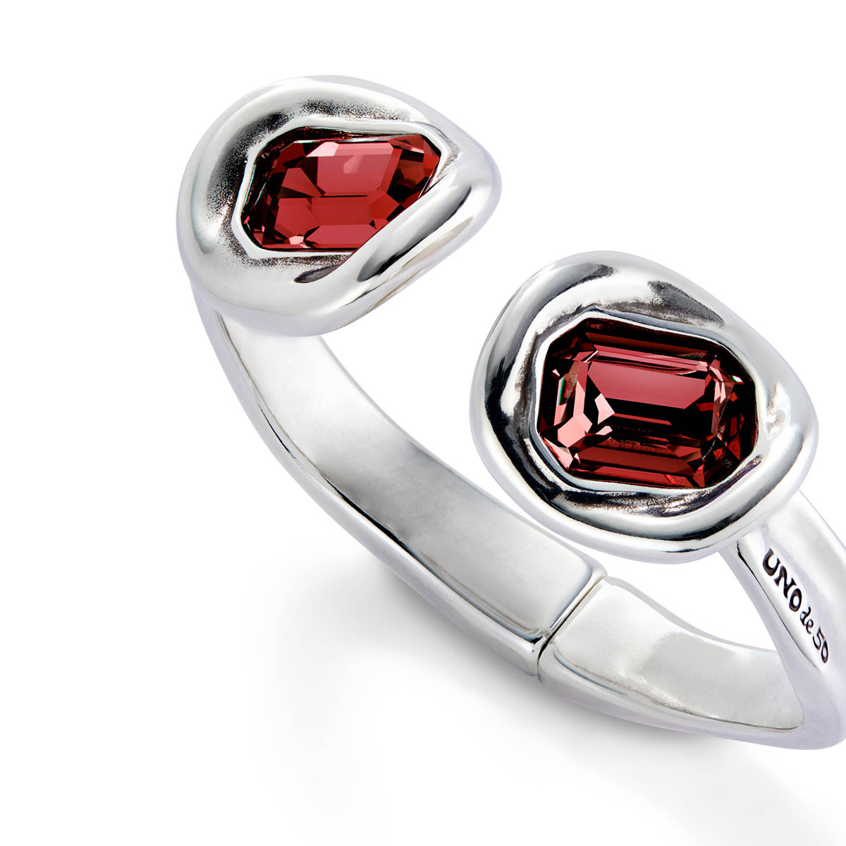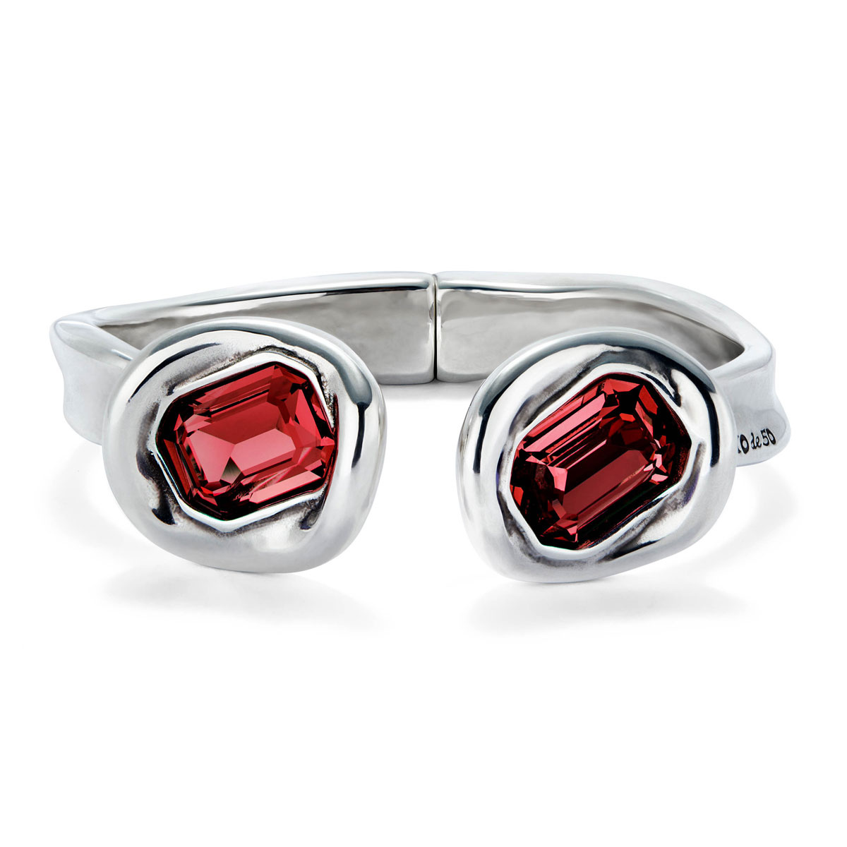 UNOde50 Armband | SER VALIENTE | ROOD is een mooie stijve sterling verzilverde armband met twee gefacetteerde rode kristallen aan de uiteinden. Gemaakt in Spanje met een 100% handgemaakt proces. Dit is het moment om op je instinct te vertrouwen en sieraden te kiezen die je altijd al wilde dragen, maar nooit hebt durven dragen.