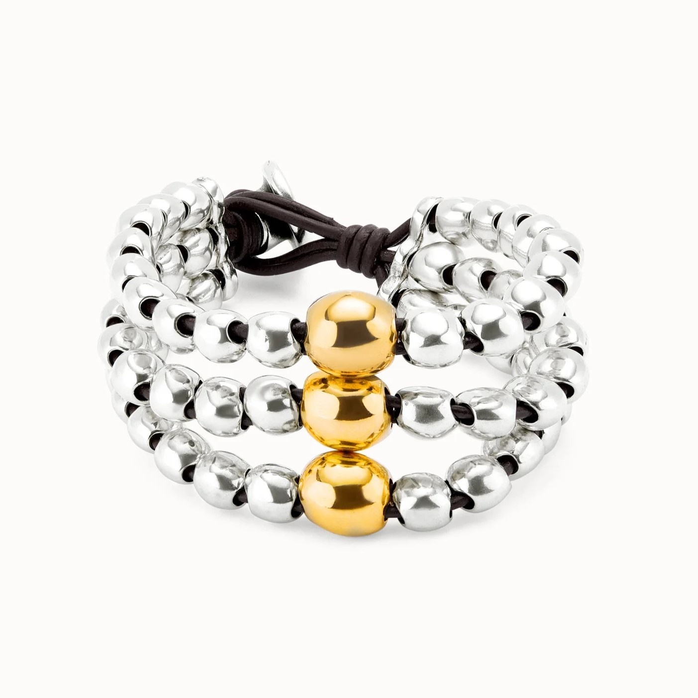 UNOde50 Armband | SER INTREPIDA is een mooie brede sterling verzilverde armband met drie rijen kraaltjes en een vergulde kraal.