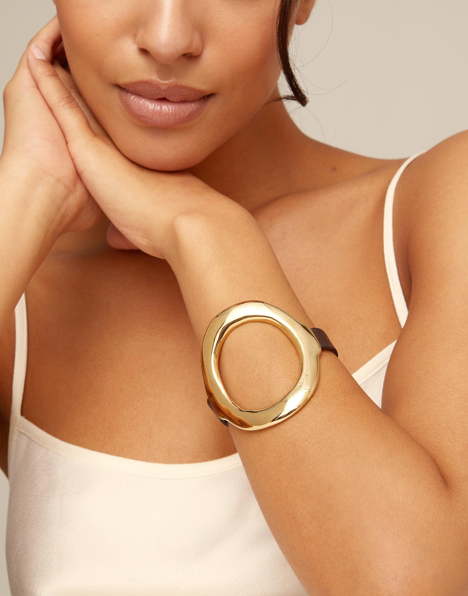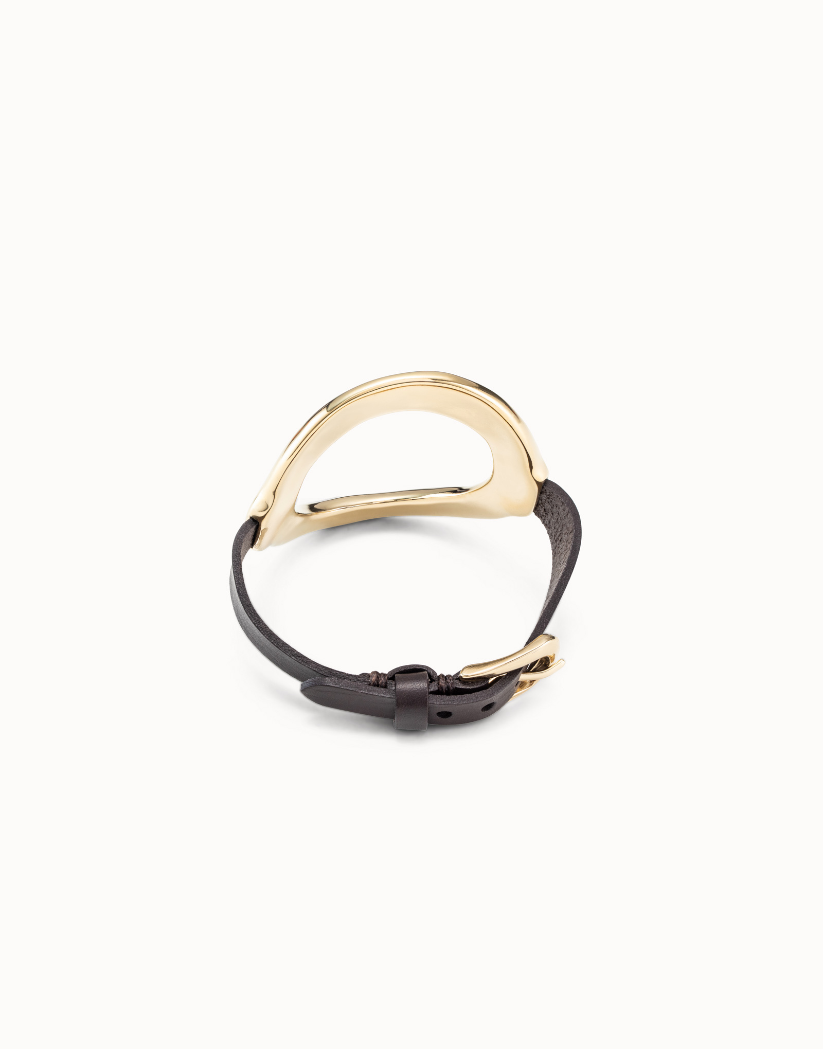 UNOde50 Armband | THANKFUL is een stoere vergulde armband bestaande uit een leren band die een groot ovaalvormig middenstuk vasthoudt. Lengte: 17 cm . Uit de GRATEFUL Collectie SS23. Handgemaakt in Spanje. Garantie: 2 jaar.