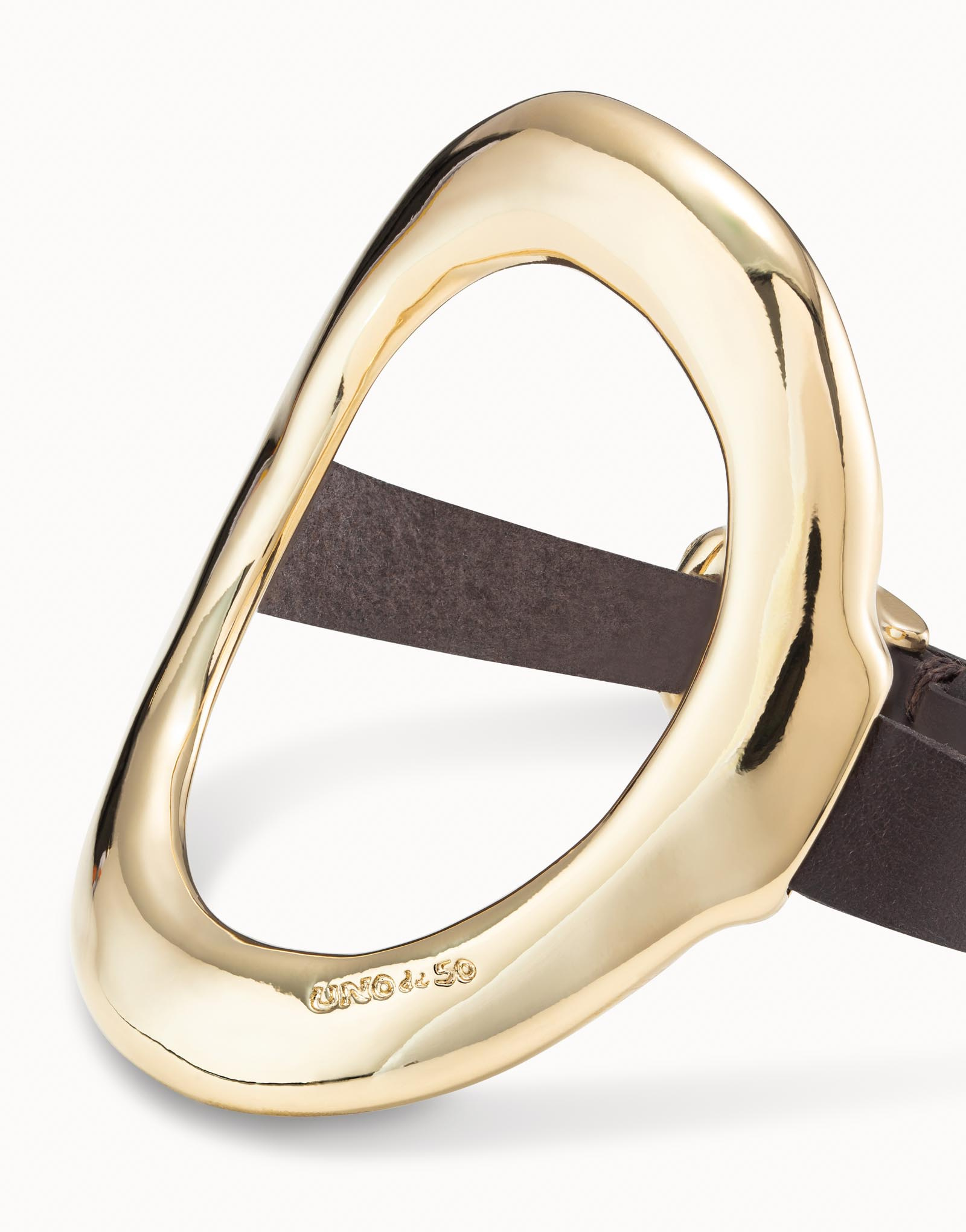 UNOde50 Armband | THANKFUL is een stoere vergulde armband bestaande uit een leren band die een groot ovaalvormig middenstuk vasthoudt. Dankzij de gespsluiting kan het stuk worden aangepast aan de gewenste maat. Deze armband is ontworpen en vervaardigd in Spanje door middel van een volledig handgemaakt proces.