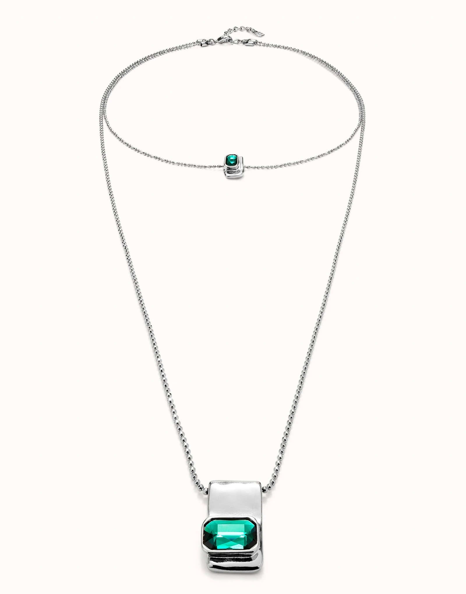 UNOde50 Ketting | SER MAGNETICA is een elegante dubbele sterling verzilverde ketting met twee verschillende lengtes en gefacetteerde groene kristallen. Ware eyecatcher. Perfecte ketting voor de feestdagen.