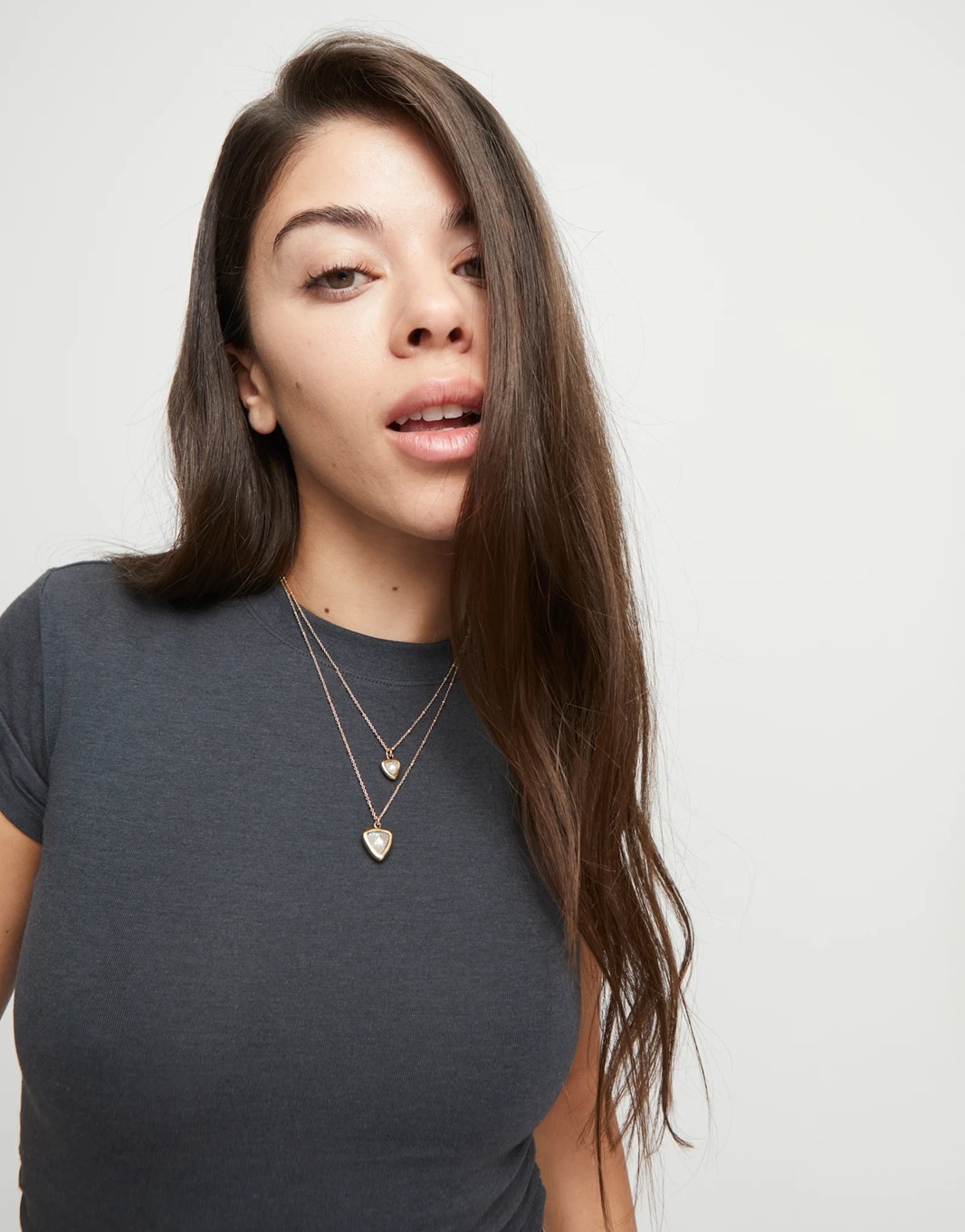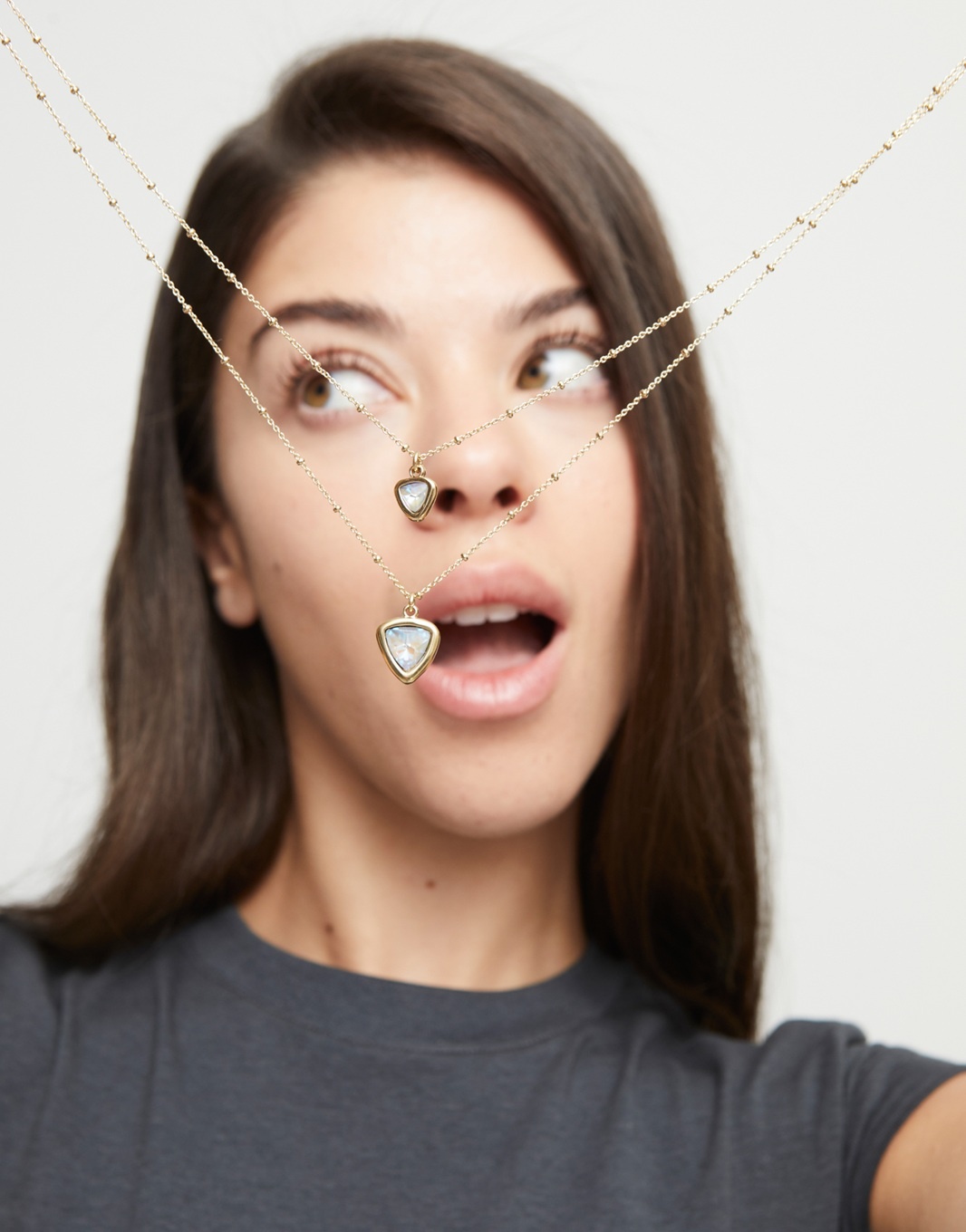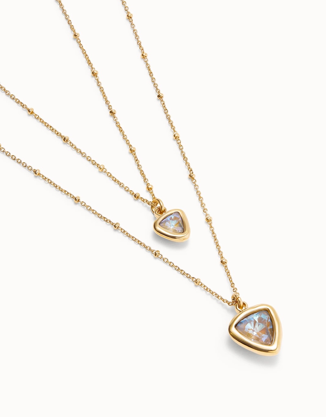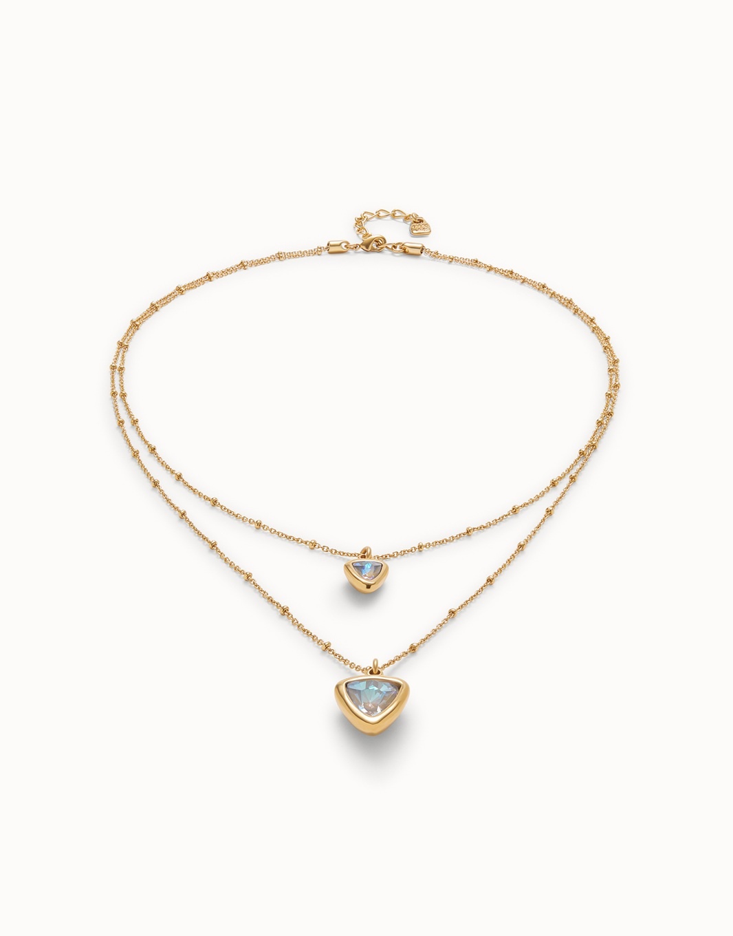 UNOde50 Ketting | SER CAMALEONICA is mooie vergulde dubbele ketting en twee veelkleurige centrale kristallen driehoeken.