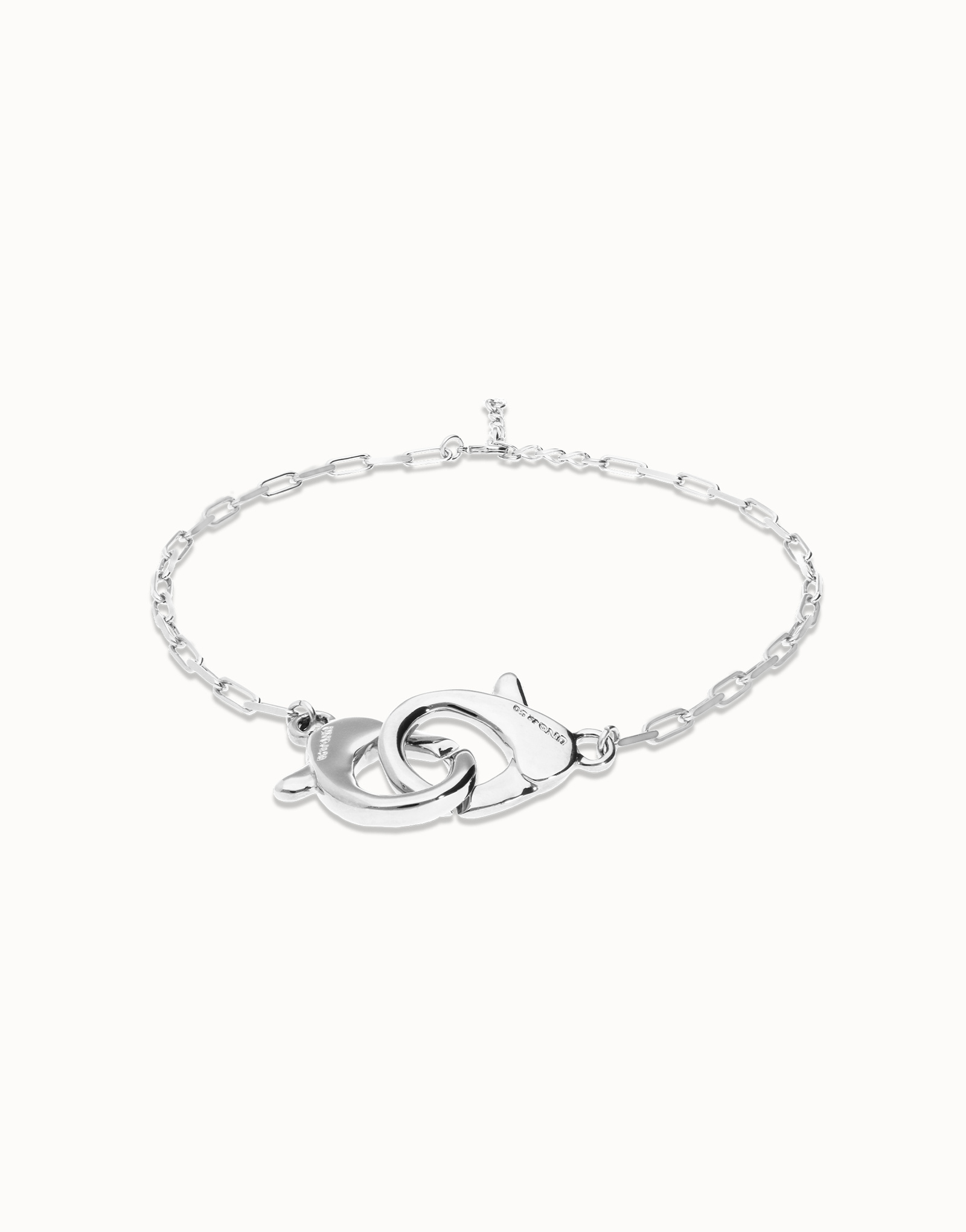 Deze robuuste ketting uit de Ser Inseparable collectie van UNOde50 is een krachtig statement van verbondenheid. Het ontwerp bestaat uit grove zilverkleurige schakels en een opvallende, verweven karabijnhaaksluiting—een symbool van complementaire energieën en onbreekbare banden. De handgemaakte afwerking en de strakke zilverkleur geven het sieraad een eigentijdse, gedurfde uitstraling. De ketting staat voor stabiliteit, loyaliteit en de kracht van relaties die ons dragen. Draag hem solo voor een krachtige look, of combineer met andere lagen voor een persoonlijke stijl die jouw verhaal vertelt.