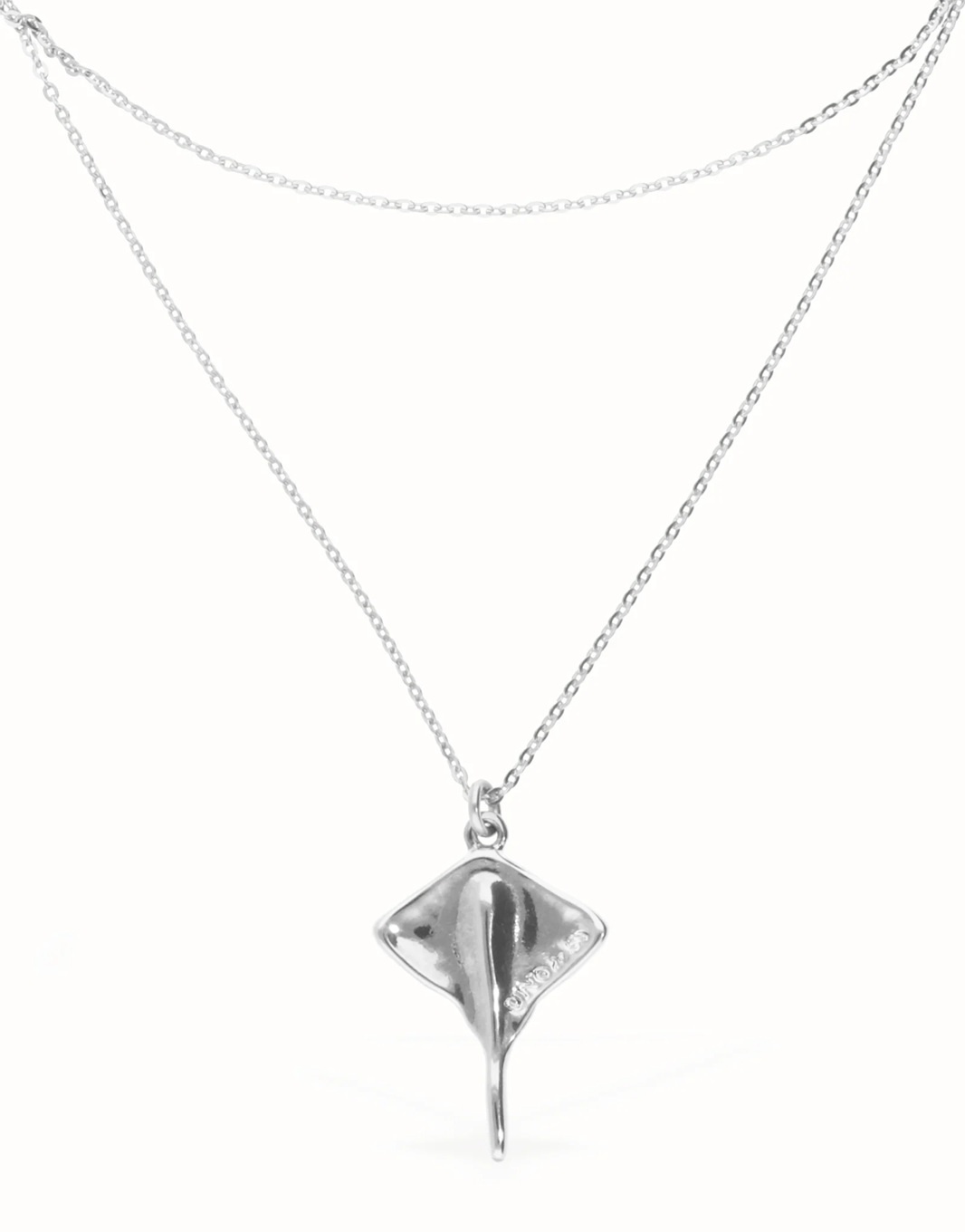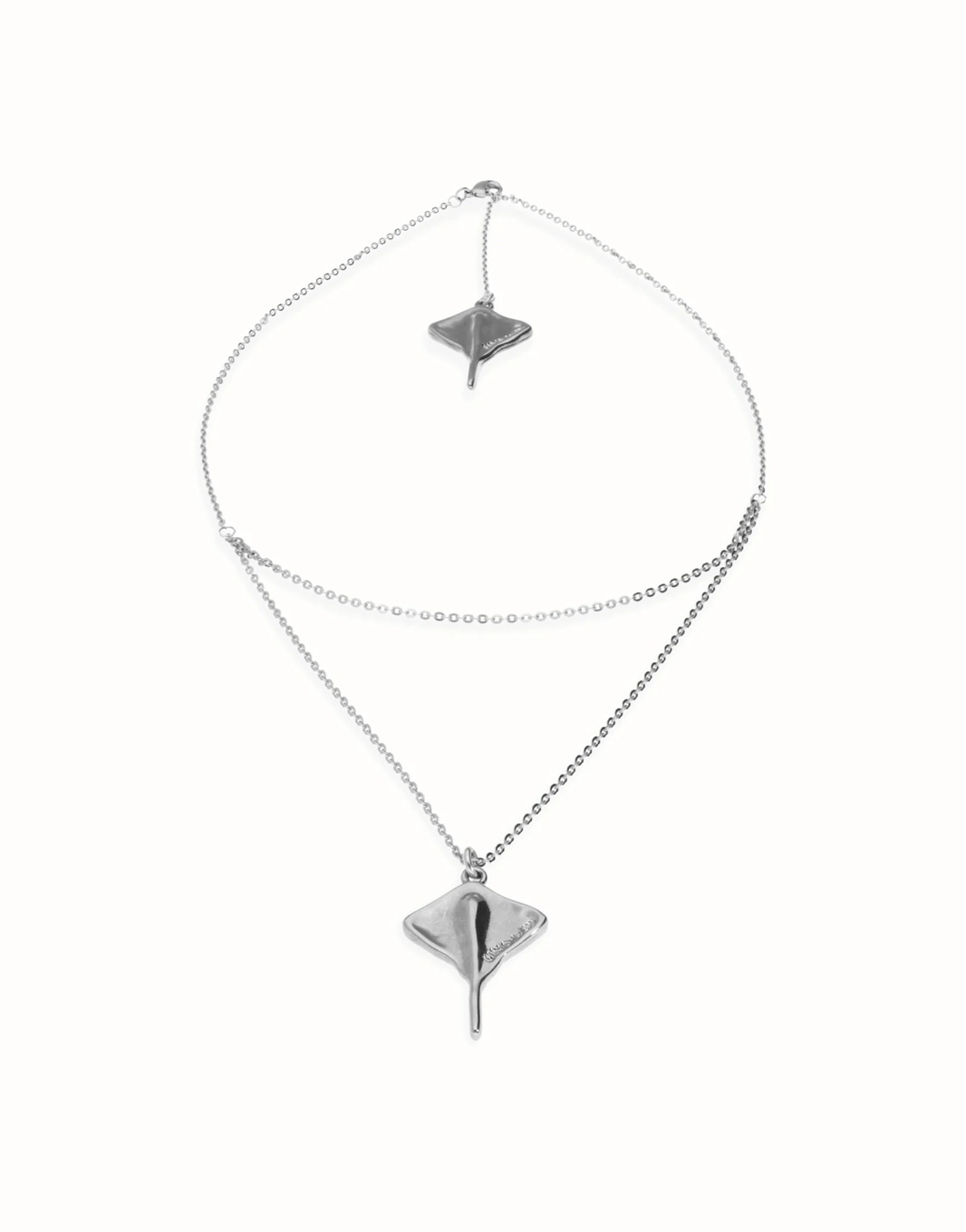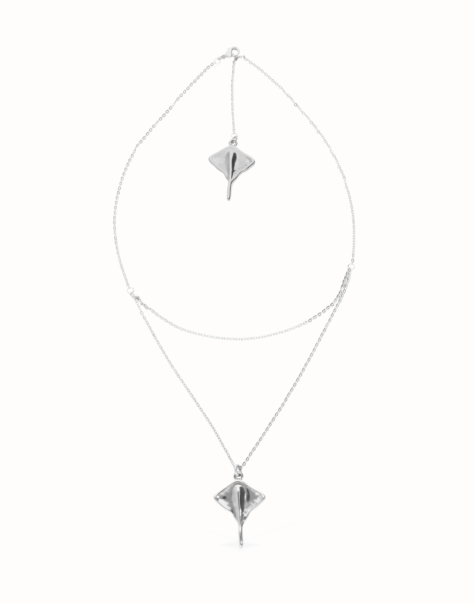Dubbele korte verzilverde kettinghanger met pijlstaartrog. Ontdek de stukken uit de collectie Ser Majestuosa, een eerbetoon aan het eiland Puerto Rico en zijn bevolking, met de elegantie van de mantarog die door de zee fladdert.