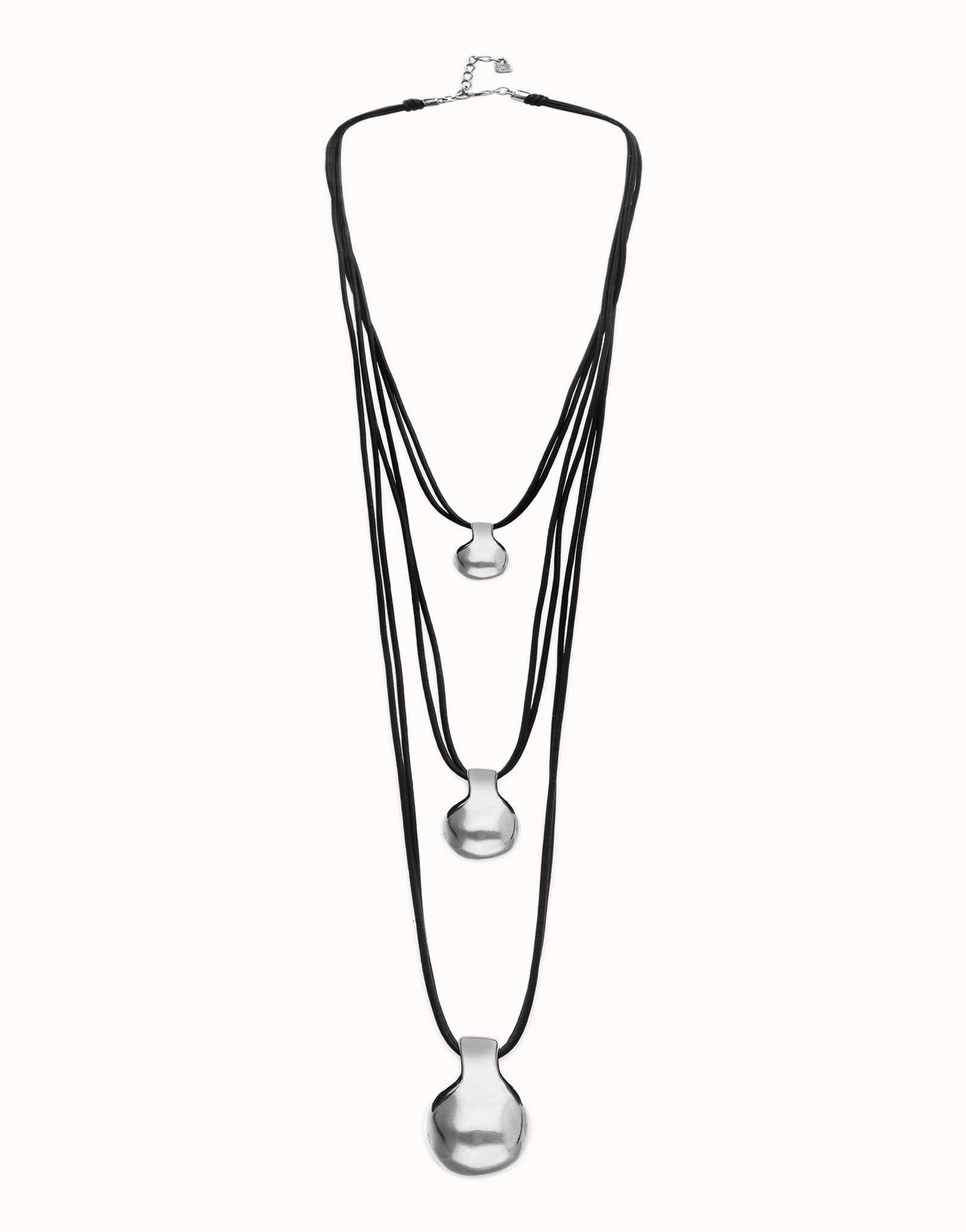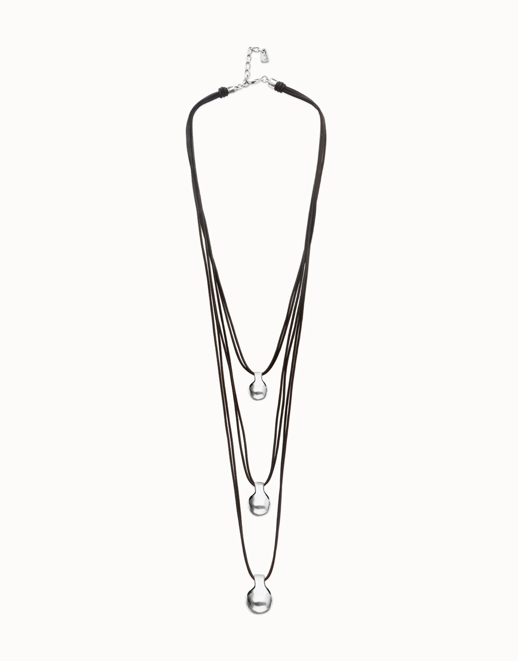 De Gravity‑collectie van UNOde50 draait om balans, energie en de kracht van natuurlijke vormen — en deze leren ketting met drie sculpturale spheres brengt dat verhaal tot leven. Het ontwerp bestaat uit meerdere leren strengen die samen een krachtig, gelaagd geheel vormen. De combinatie van soepel leer en verzilverde elementen zorgt voor een stoere, maar verfijnde uitstraling.
