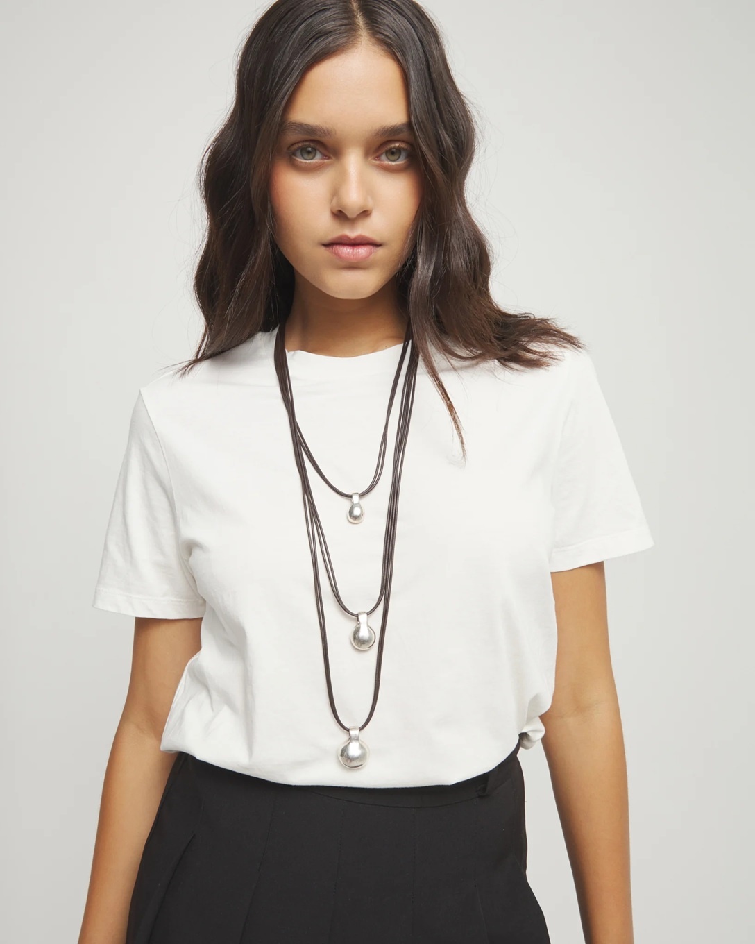 Centraal in het ontwerp bevinden zich drie organisch gevormde spheres, elk met een licht imperfecte, handgemaakte afwerking. Ze creëren een ritmisch spel van volumes en beweging, alsof ze door een onzichtbare zwaartekracht bij elkaar worden gehouden. Het leer vormt een warm contrast met het koele metaal en geeft de ketting een natuurlijke, bijna aardse uitstraling.