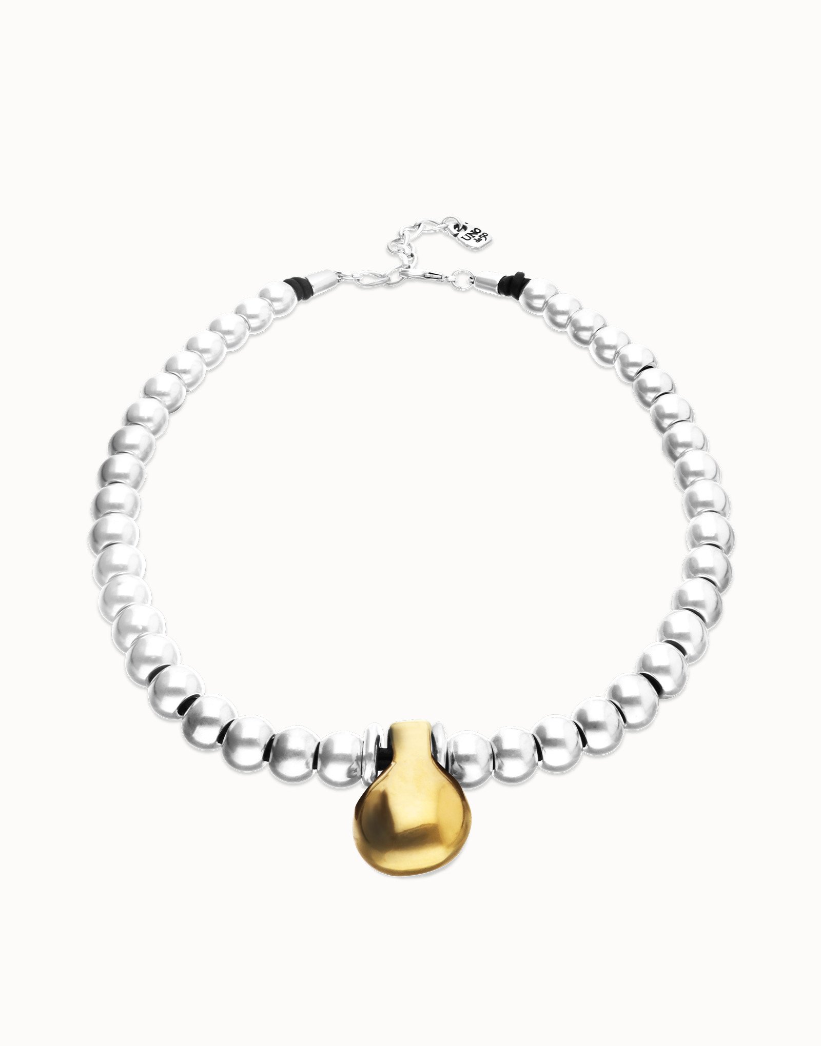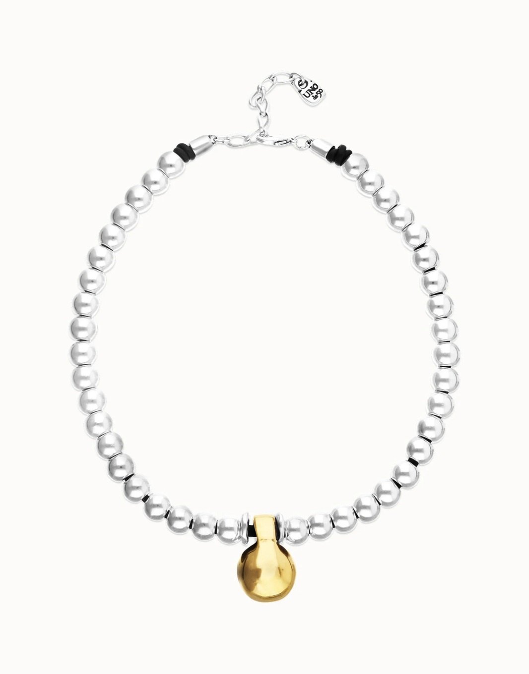 De Gravity‑collectie van UNOde50 staat bekend om haar spel tussen energie, ritme en balans — en deze korte ketting met verzilverde beads en een vergulde sphere is daar een prachtig voorbeeld van.