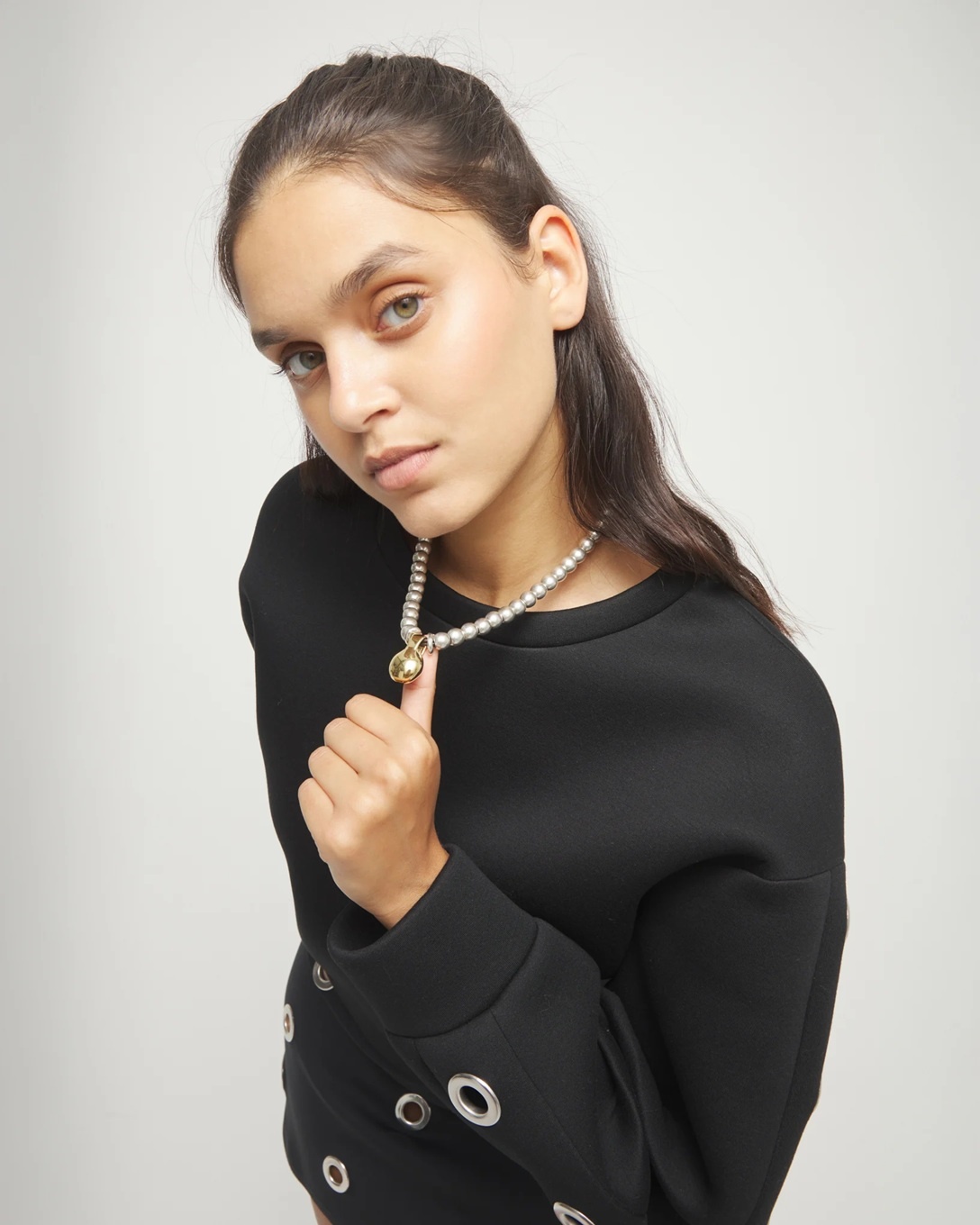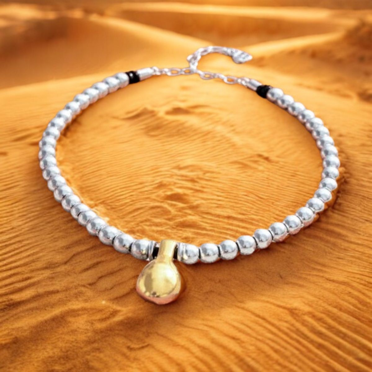 De ketting bestaat uit een reeks afgeronde, verzilverde beads die als een vloeiende cadans om de hals vallen. Ze bewegen soepel mee met elke stap en vangen het licht op een warme, levendige manier. In het midden schittert een vergulde, organisch gevormde sphere: het gouden zwaartepunt dat het ontwerp zijn kracht en moderne uitstraling geeft.
