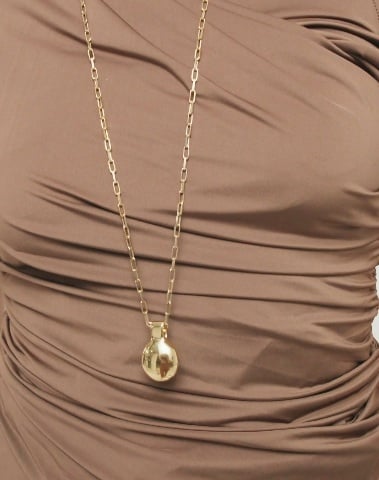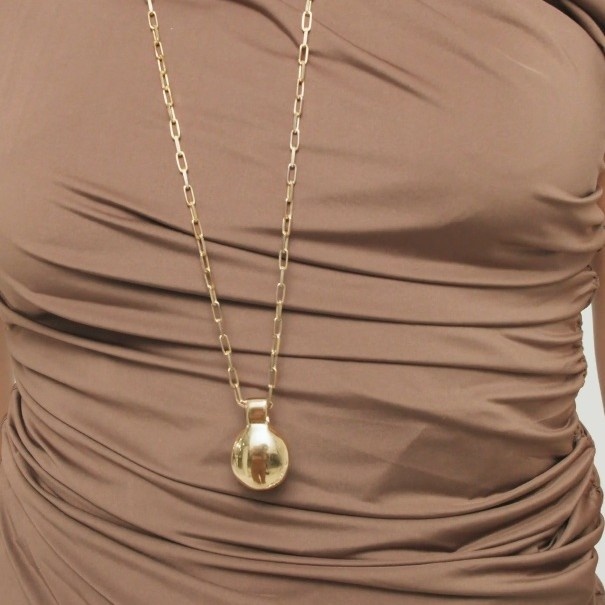 Centraal hangt een grote, organisch gevormde vergulde sphere: een sculpturaal element dat het licht zacht en sereen vangt. De imperfecte, handgemaakte vorm geeft de ketting een warme, authentieke uitstraling en fungeert als symbolisch ankerpunt — een subtiele herinnering aan wat echt belangrijk is.