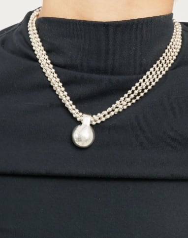 De ketting bestaat uit meerdere fijne, verzilverde draadstructuren die soepel om de hals vallen en een subtiele, levendige glans creëren. In het midden vind je een opvallende, organisch gevormde sphere: een modern, gepolijst element dat de aandacht trekt zonder te overheersen.