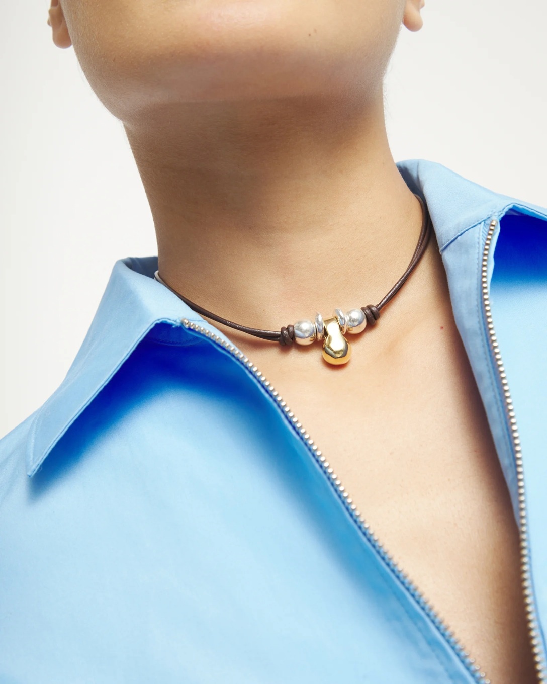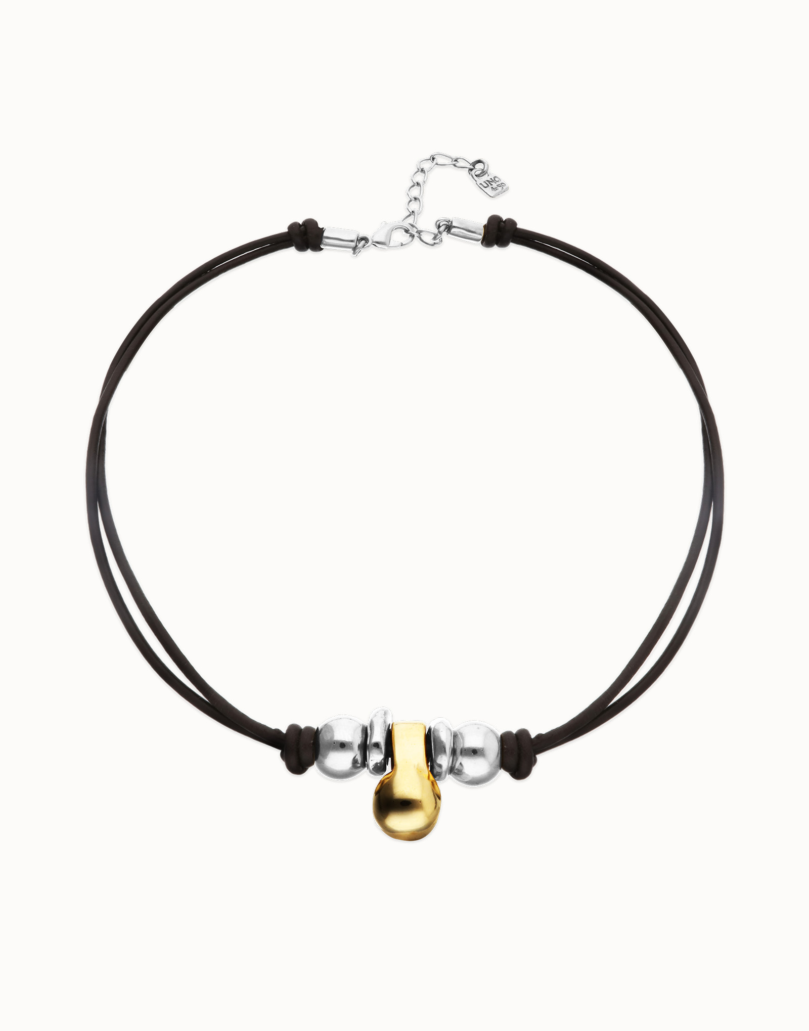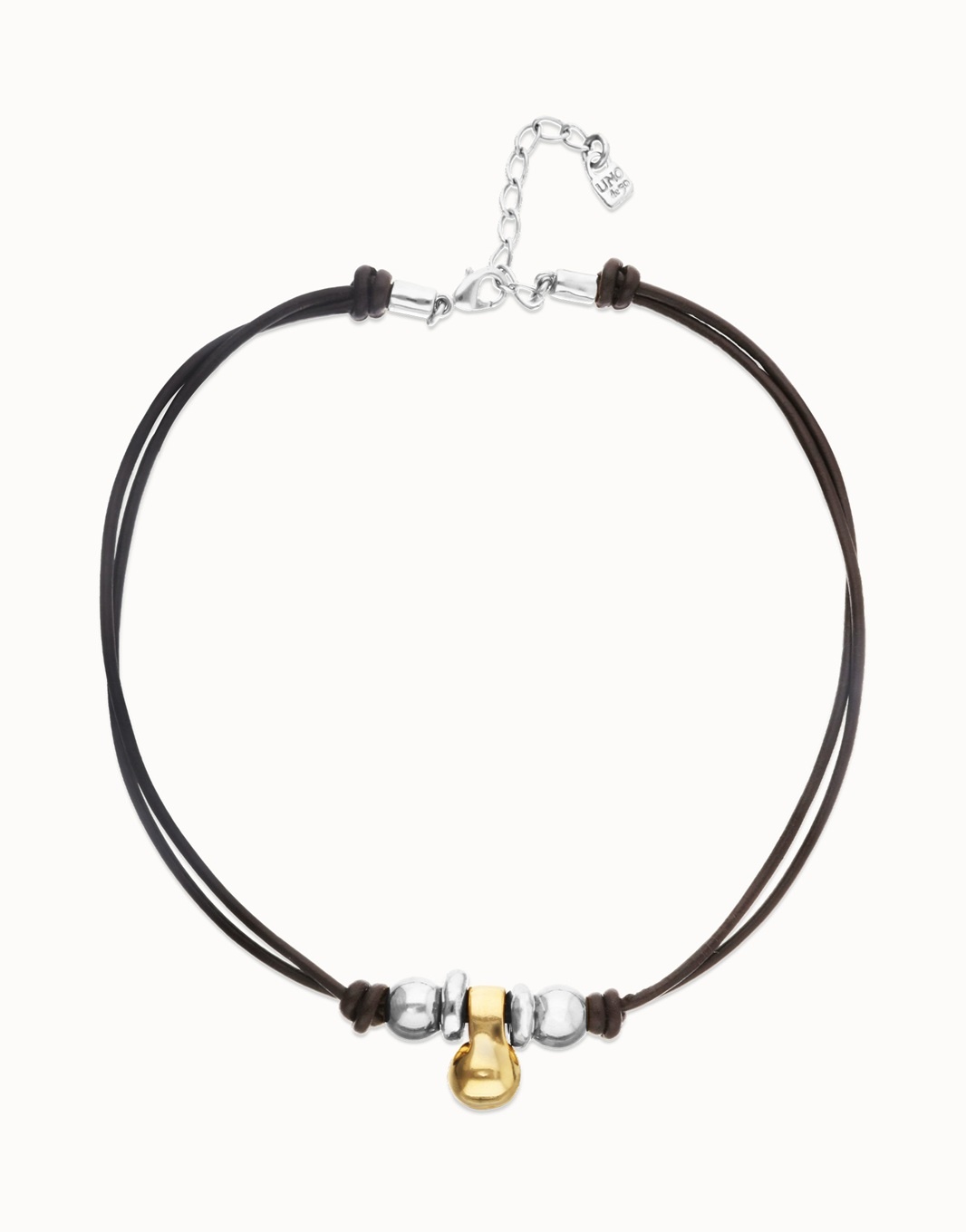 De combinatie van zacht, karaktervol leer en glanzend metaal geeft deze ketting een moderne, minimalistische uitstraling met een stoere rand. Het is een sieraad dat zowel bij casual outfits als bij uitgesproken looks past en dat dankzij het handgemaakte karakter die typische UNOde50‑identiteit draagt.