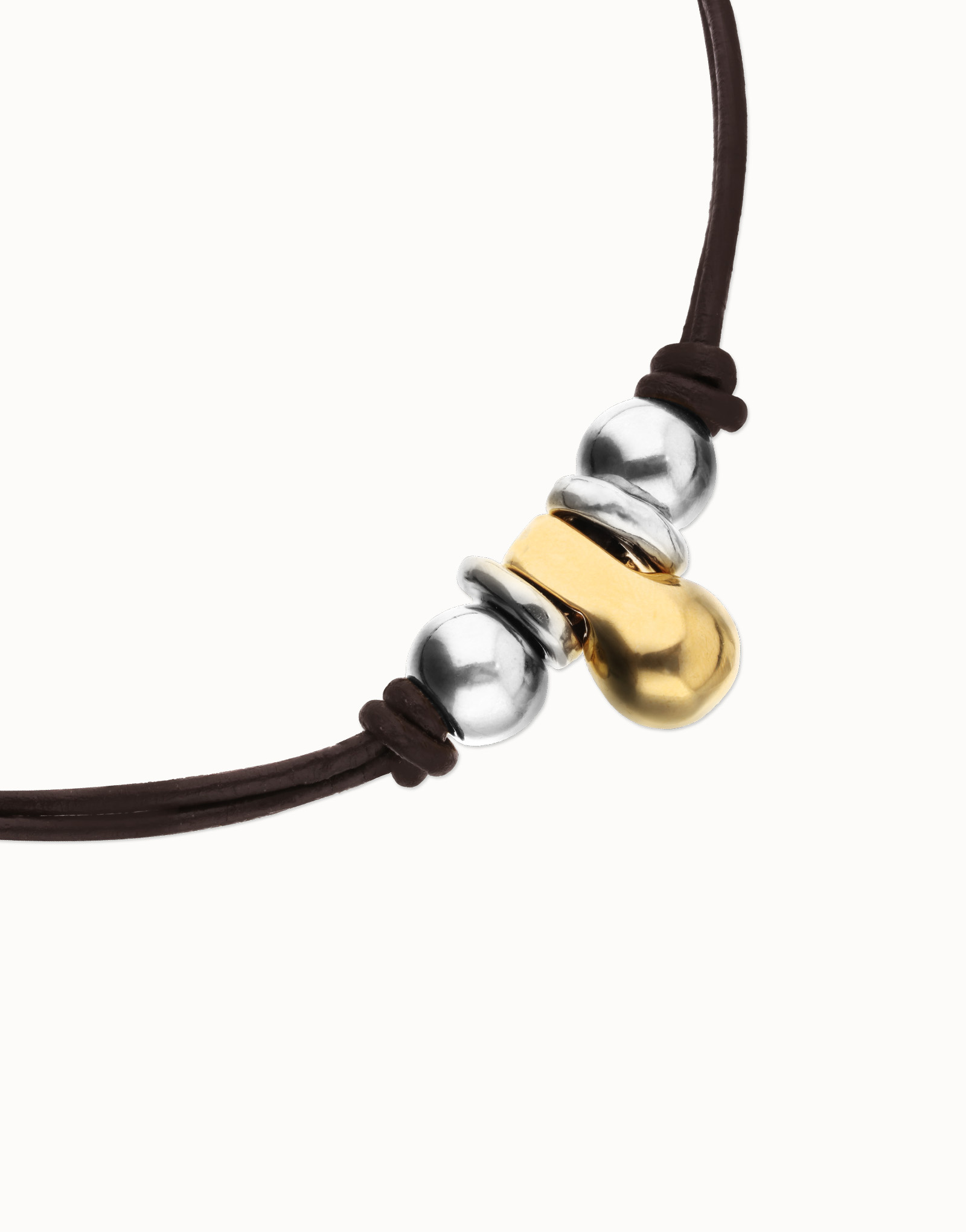 De UNOde50 ketting COL2064OROMTL uit de Gravity collectie is ontworpen voor wie houdt van sieraden die met je meebewegen. De meerdere leren koorden vormen een soepele, krachtige lijn die natuurlijk over de huid valt en elke beweging volgt. In het midden komen drie organische, spheres (2 verzilverde en 1 vergulde) samen, alsof ze naar elkaar toe worden getrokken. De grootste, gepolijste bol creëert een subtiel zwaartepunt dat het ontwerp visueel in balans brengt.