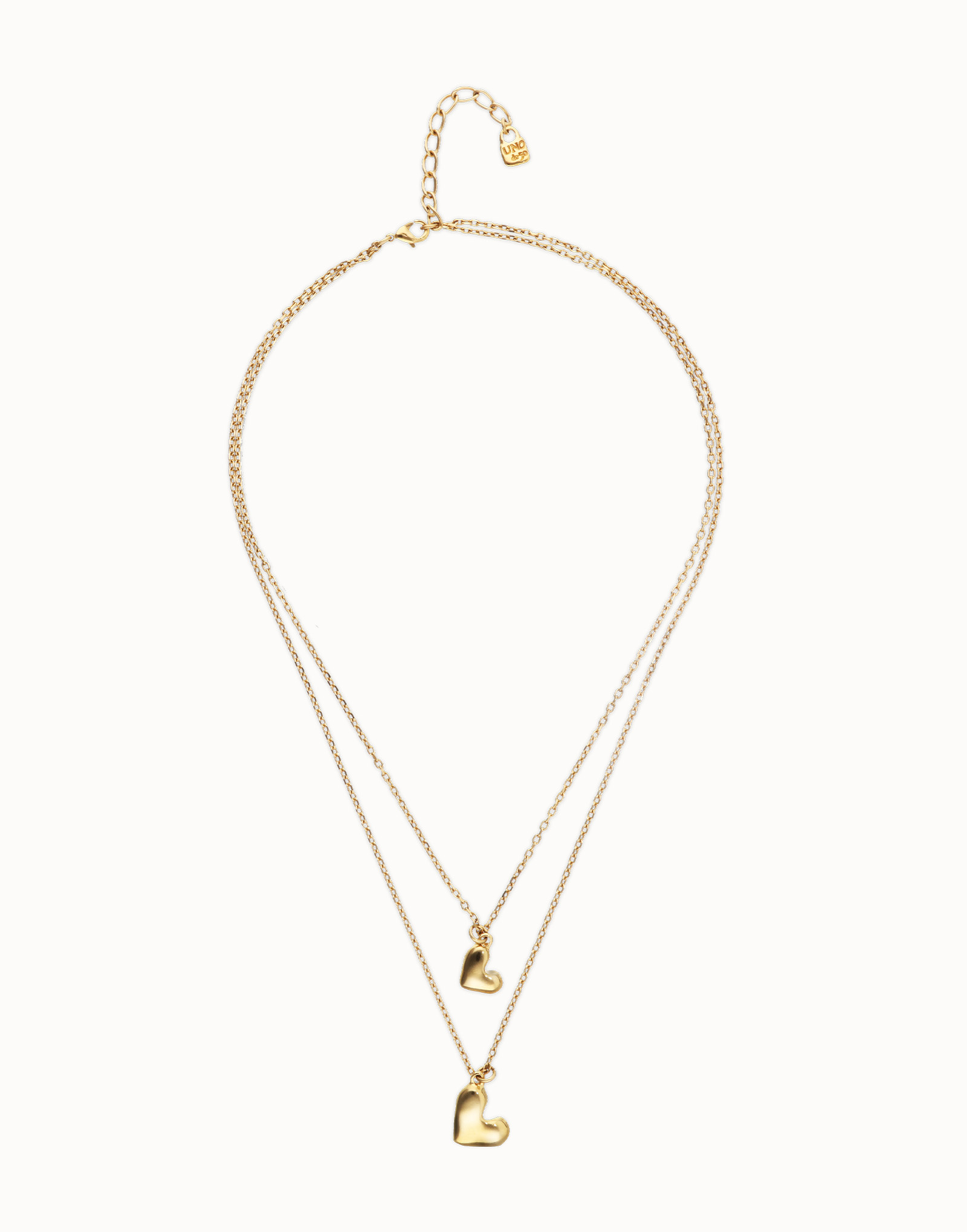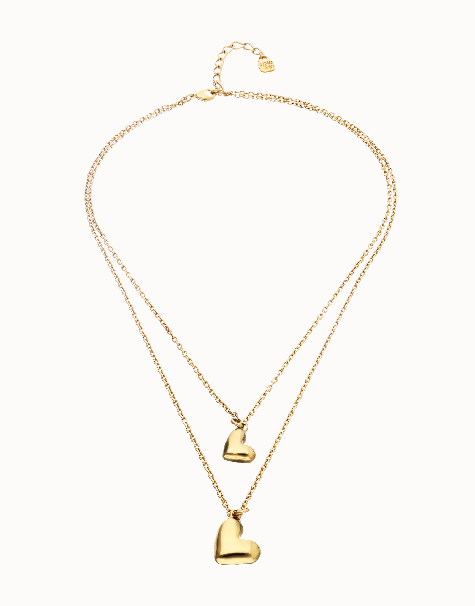Deze ketting vertelt een verhaal: twee harten die symbool staan voor intuïtie, verbinding en het volgen van je eigen pad. De dubbele laag geeft een speels, modern effect en maakt dit sieraad perfect om solo te dragen of te combineren met andere UNOde50 kettingen.