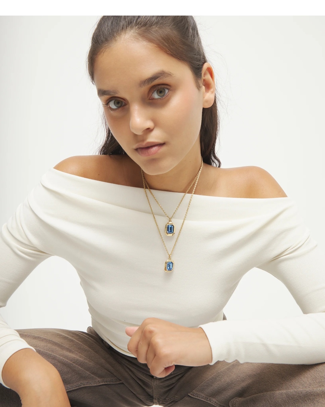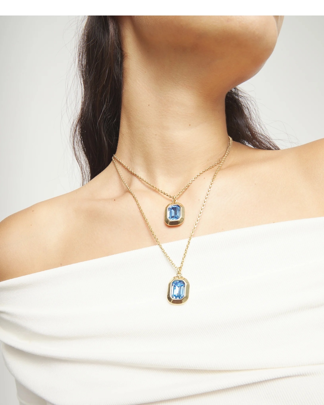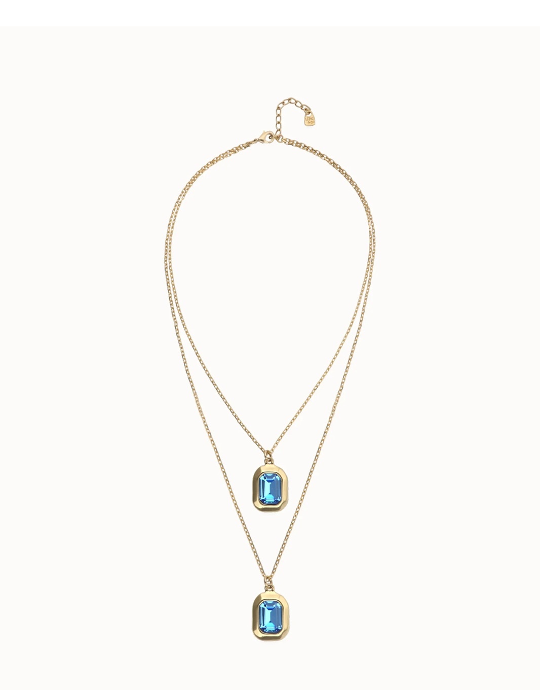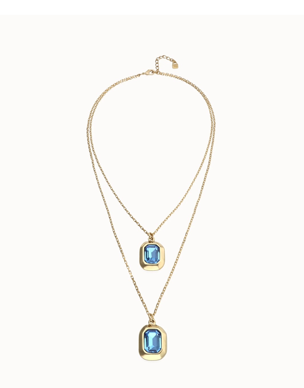 De vergulde dubbele ketting met twee rechthoekige blauw gefacetteerde kristallen van UNOde50 combineert luxe, symboliek en een modern gelaagd ontwerp. De twee kristallen vallen op verschillende lengtes en vormen samen het stralende middelpunt van het sieraad. De warme goudkleurige afwerking versterkt de diepte van het blauwe kristal en geeft de ketting een elegante, tijdloze uitstraling. Het ontwerp volgt de natuurlijke beweging van groei en ontwikkeling, waardoor het een betekenisvol stuk is dat dicht bij het hart gedragen wordt.