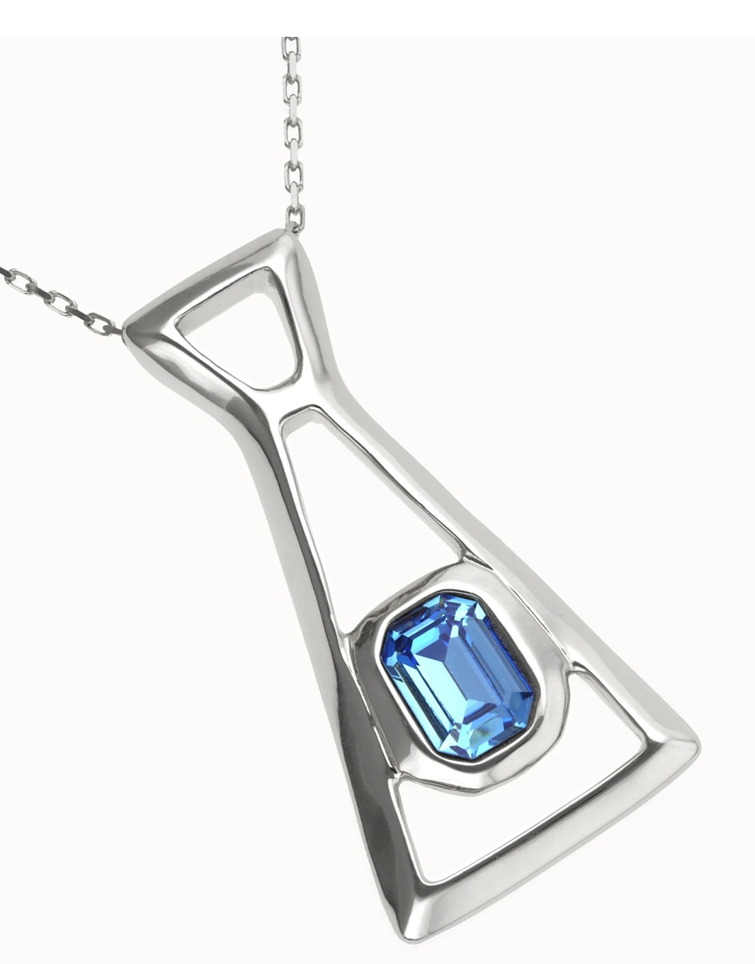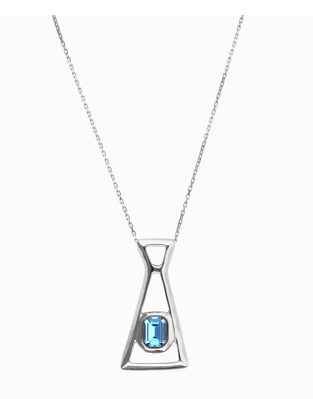 Lange verzilverde UNOde50 ketting met rechthoekig blauw gefacetteerd kristal. Het ontwerp symboliseert een reis van binnen naar buiten en combineert elegantie, eenvoud en betekenis in één tijdloos sieraad. Lengte: 81 - 86 cm | Uit de CORE SS26
