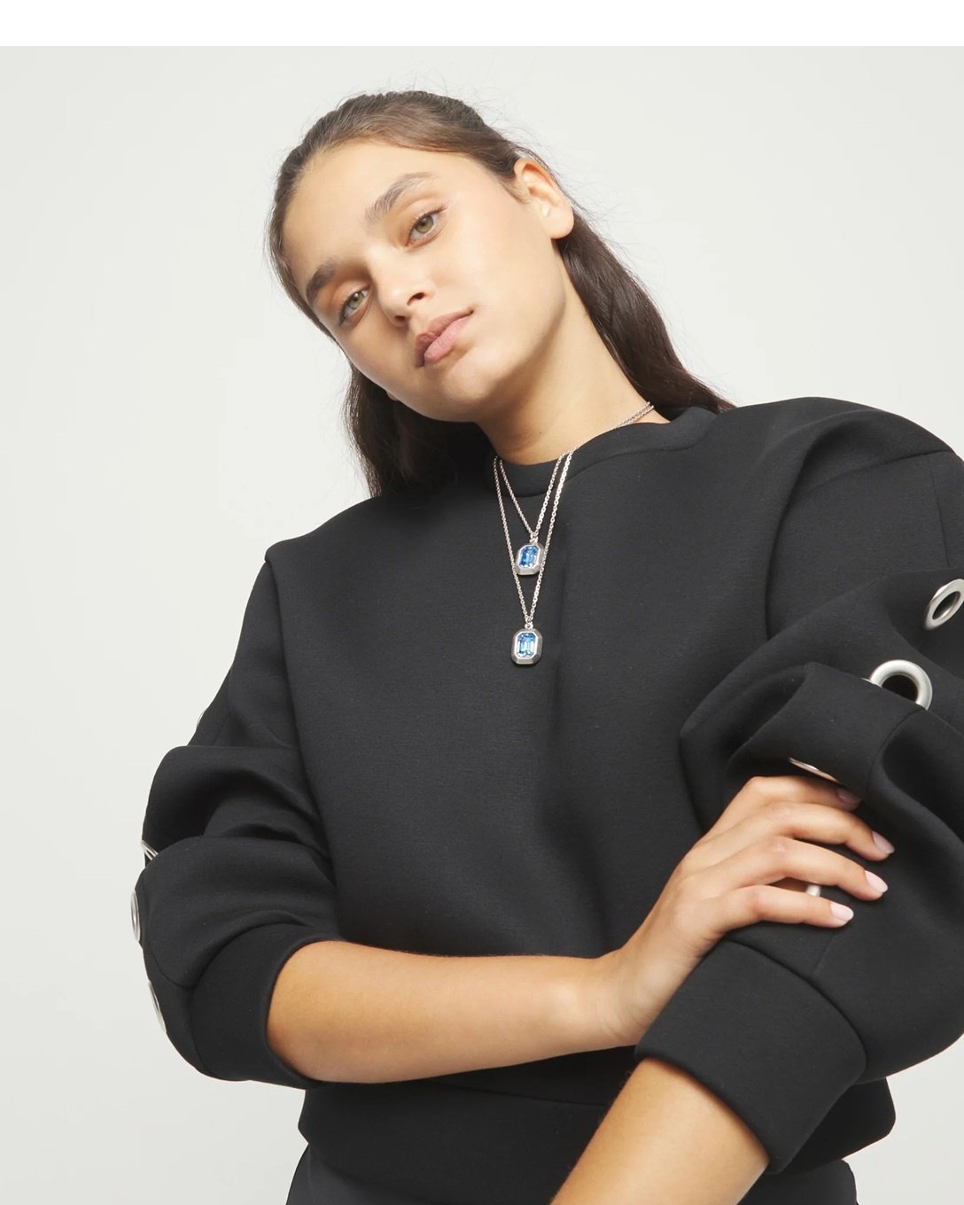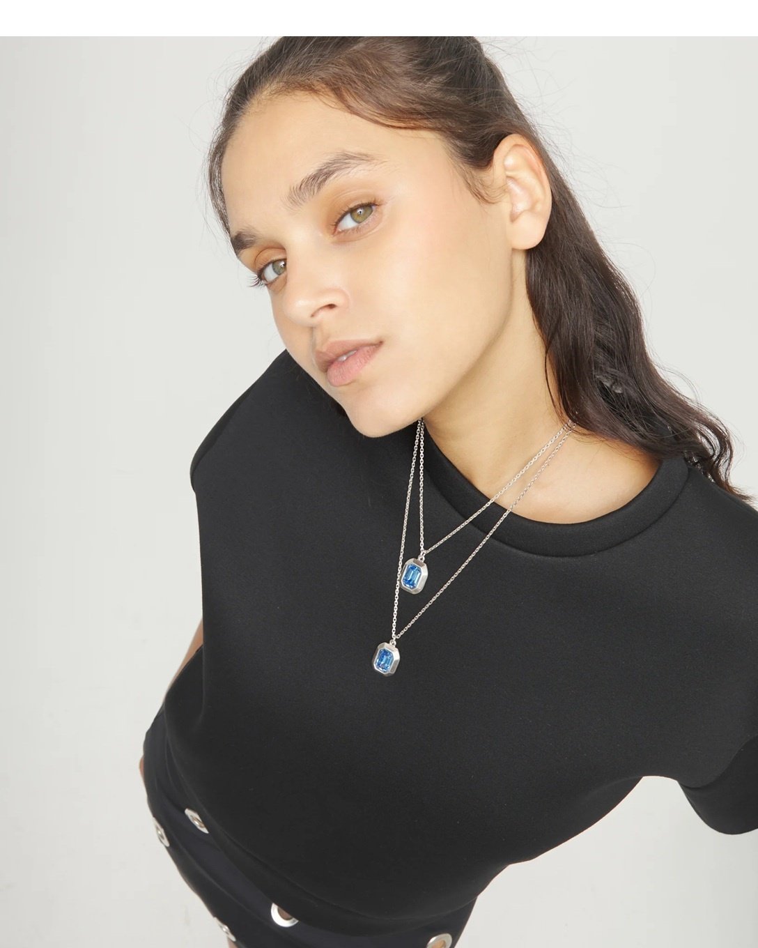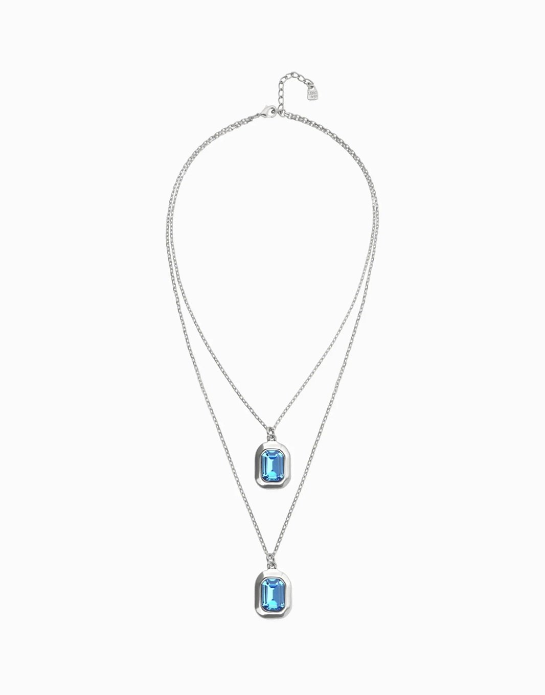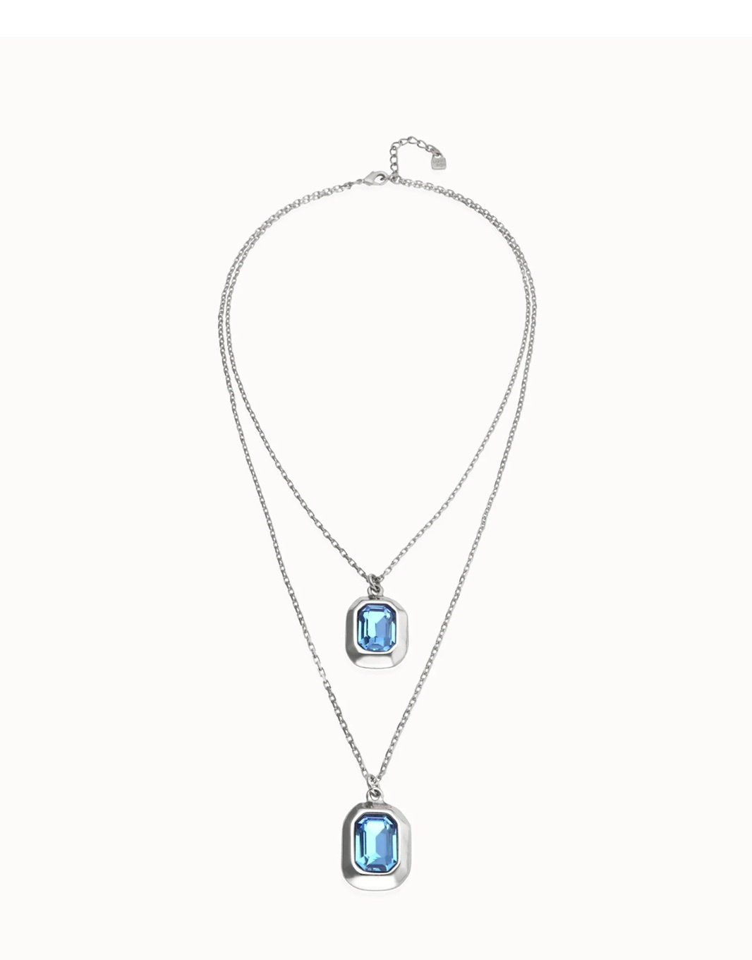 De dubbele ketting met twee rechthoekige blauw gefacetteerde kristallen van UNOde50 is een elegant, gelaagd ontwerp dat speelt met lengte en licht. De twee kristallen vormen samen het emotionele middelpunt van het sieraad en geven diepte, kleur en betekenis aan elke look. De zilverkleurige afwerking versterkt het serene, moderne karakter van de ketting en maakt dit ontwerp een tijdloze keuze voor dagelijks dragen én speciale momenten.
