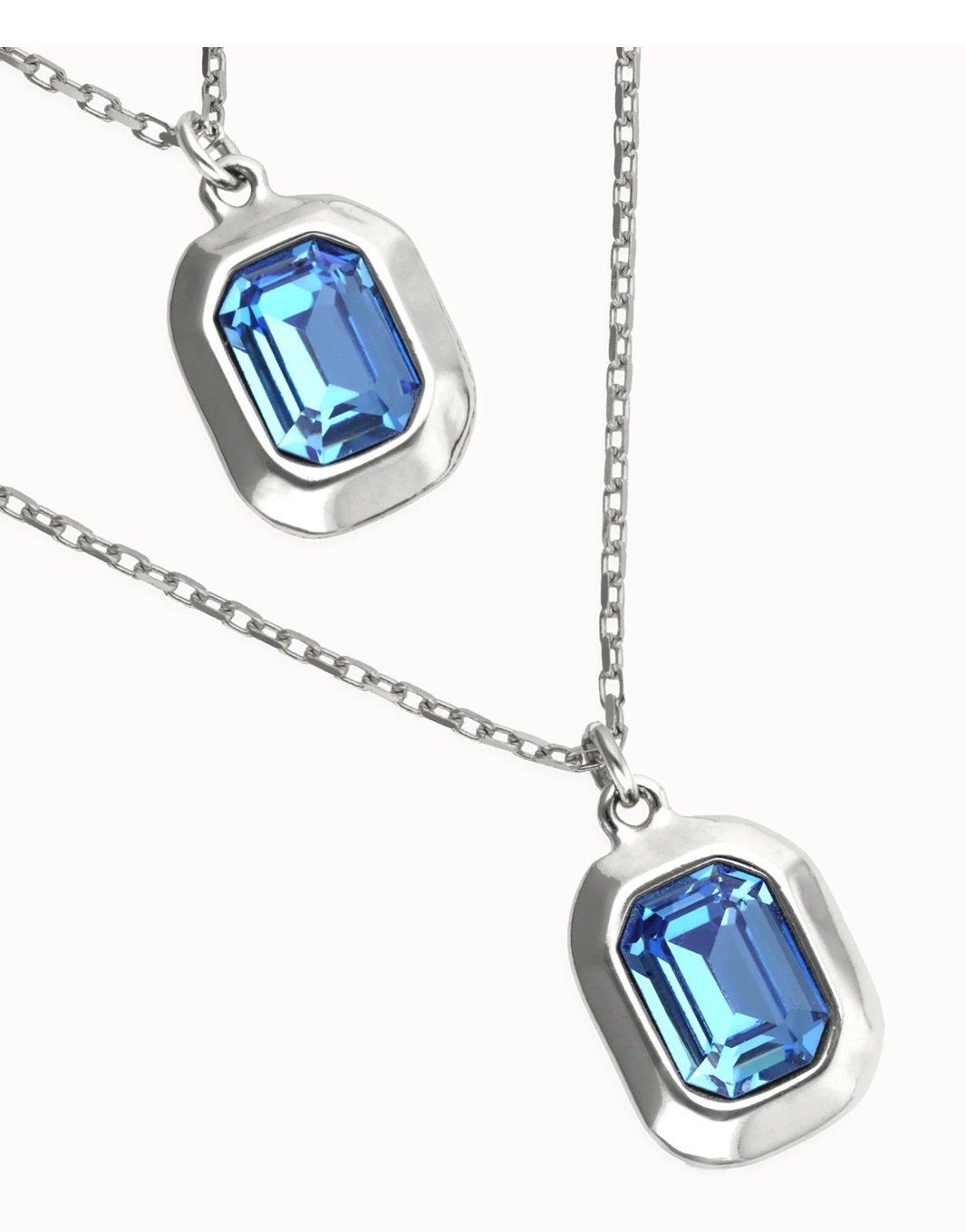 Elegante dubbele UNOde50 ketting met twee blauw gefacetteerde kristallen die op verschillende lengtes vallen. Het gelaagde ontwerp geeft een speels, tijdloos effect en versterkt het serene karakter van de sterling‑silver look.