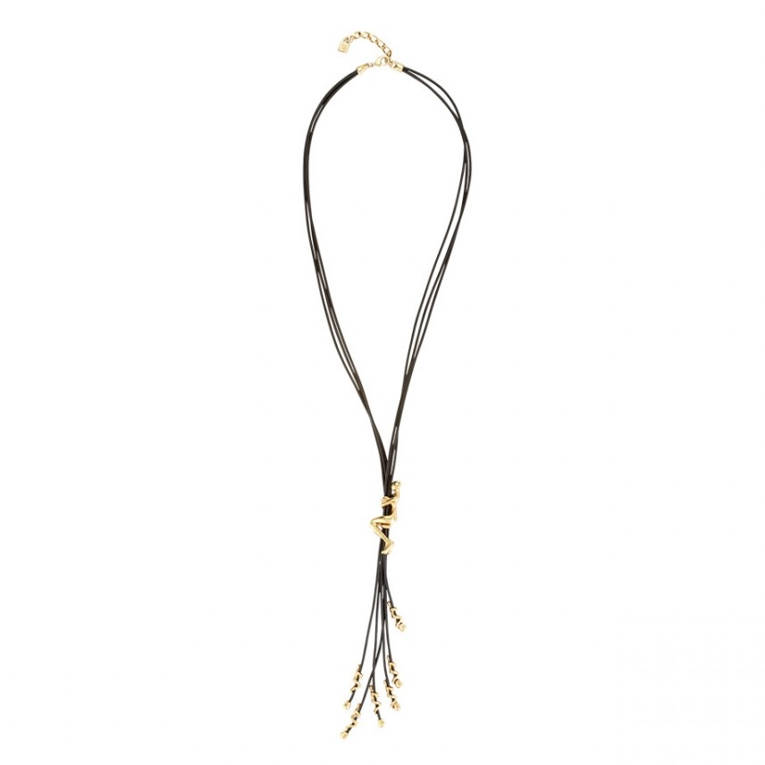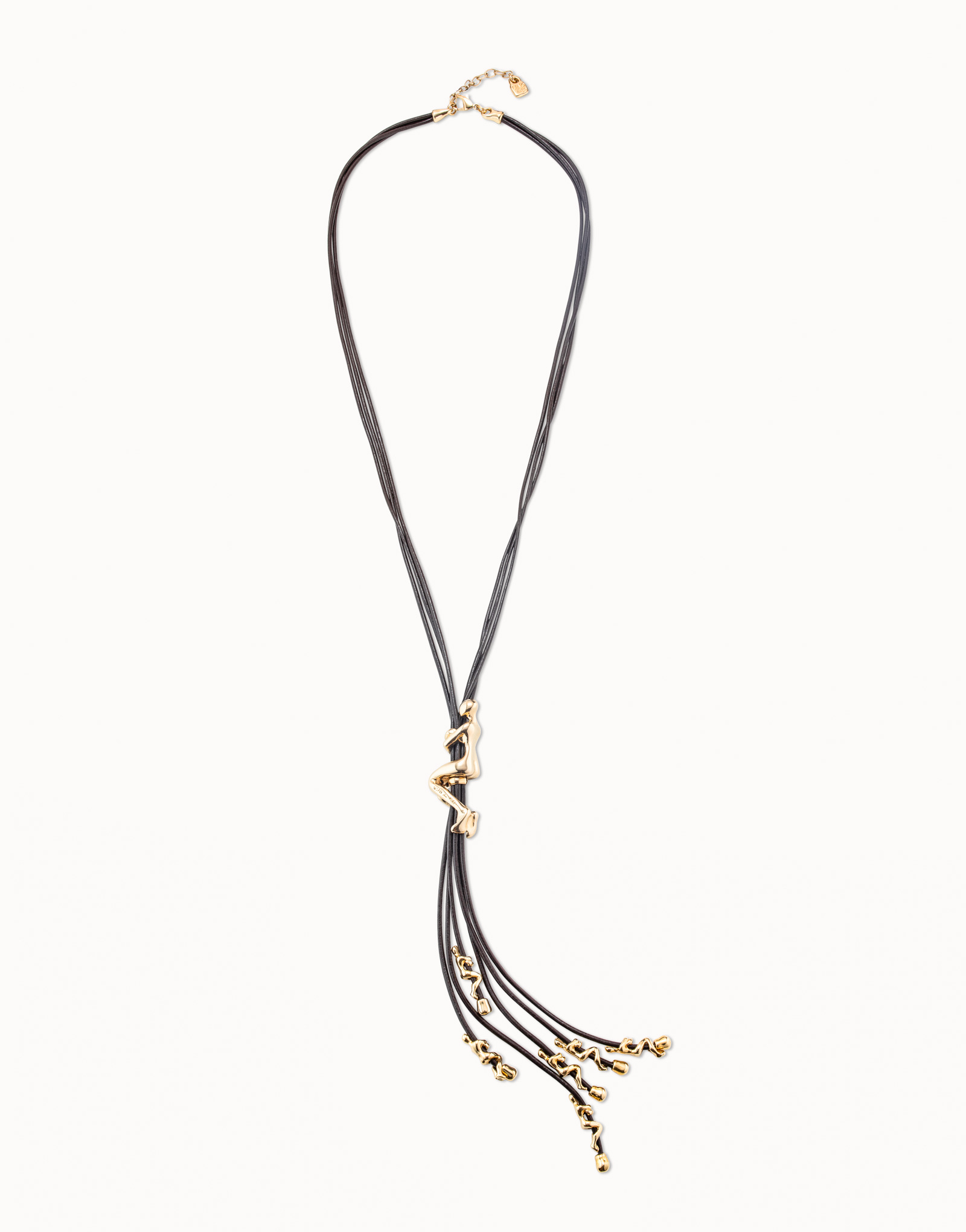 UNOde50 Ketting SKALATOR is een lange ketting van bruine lederen veters met originele vergulde elementen aan het uiteinden. En in het midden een verguld figuur dat in hoogte verstelbaar is.