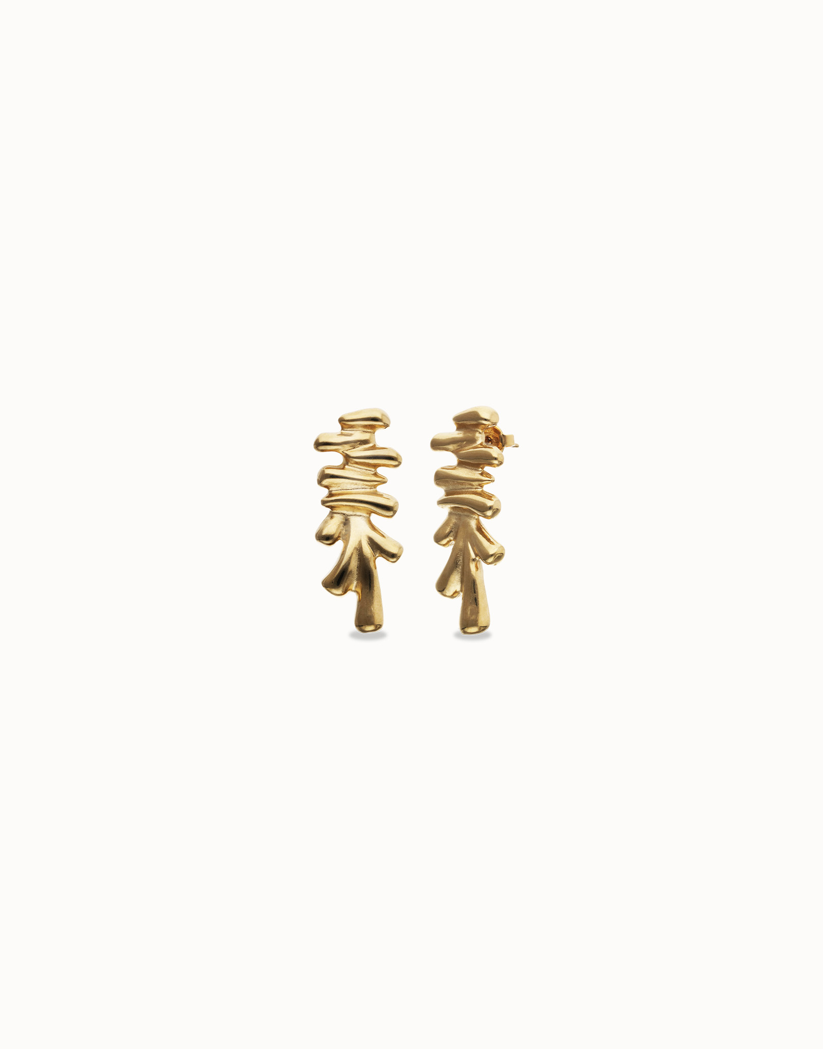 De vergulde UNOde50 PEN1070ORO oorbellen zijn elegante, langgerekte drops met een onregelmatige, organische vorm. Het ontwerp is geïnspireerd op de natuurlijke, vloeiende lijnen van de ROOTS‑collectie en straalt kracht, warmte en moderne verfijning uit.