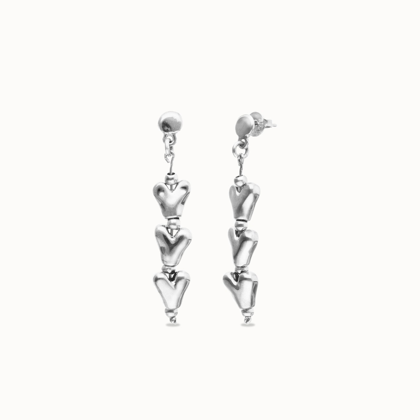 De verzilverde afwerking geeft deze oorbellen een tijdloze, frisse glans. Dankzij het subtiele formaat zijn ze perfect voor dagelijks gebruik, terwijl de dubbele hartvorm toch een romantisch en betekenisvol statement maakt. De oorbellen zijn handgemaakt in Spanje, waardoor elk paar een unieke artistieke signatuur draagt.