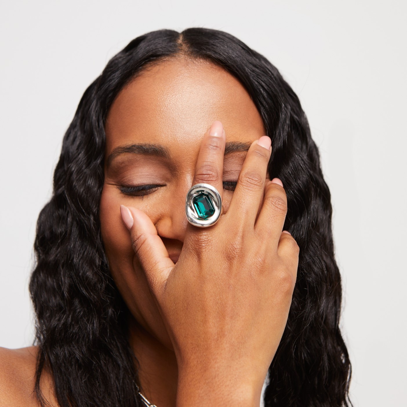 UNOde50 Ring | SER VALIENTE | GROEN is een sterling verzilverde ring met centrale gefacetteerde groene kristal.  Uit de SER VALIENT Collectie SS24 | In meerdere maten | Handgemaakt in Spanje. Garantie: 2 jaar.