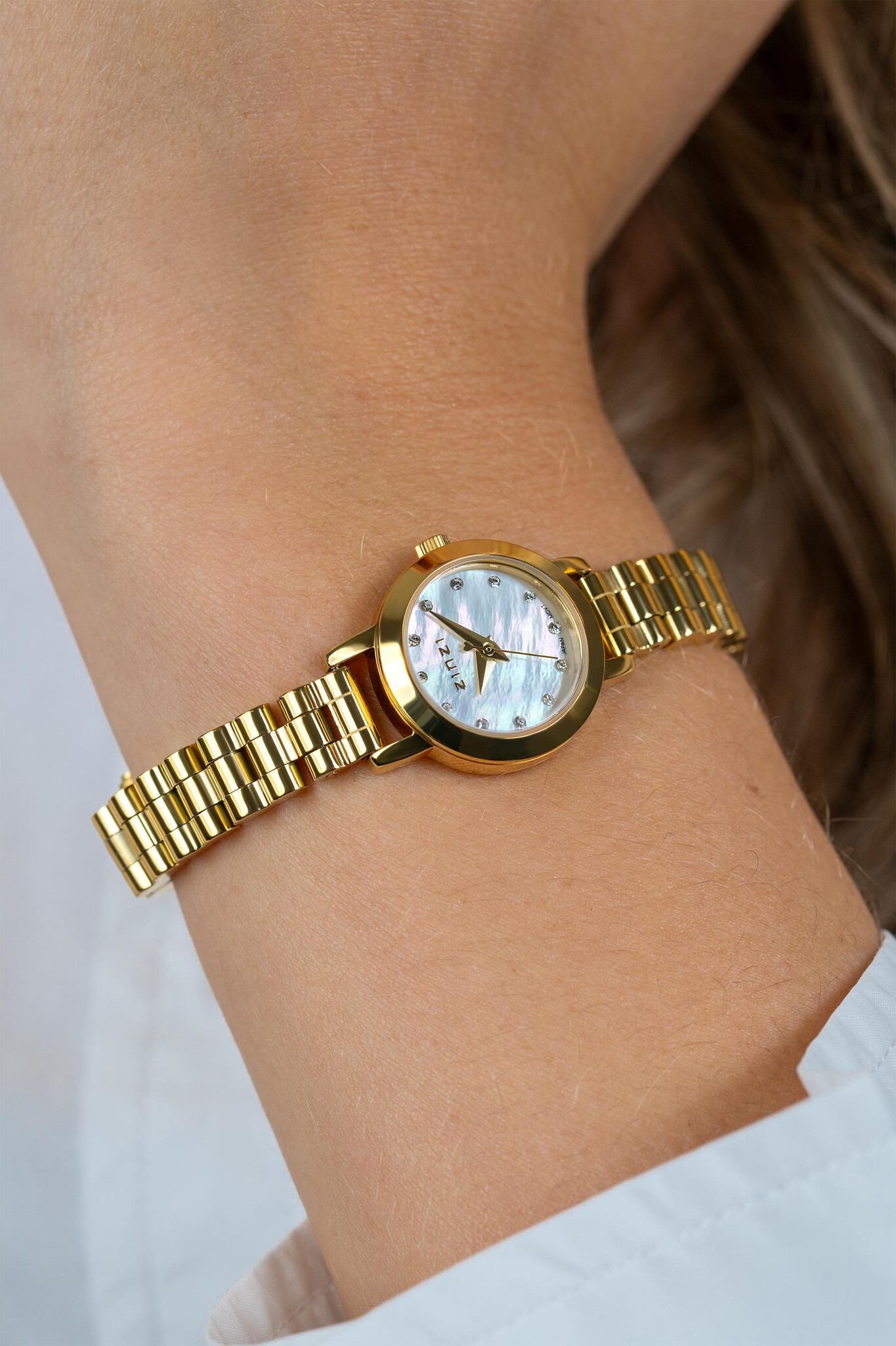 Het ZINZI 'Etoile Nuit' horloge is een mini ontwerp met een 20mm ronde goudkleurige kast. Een elegante mix van tijdmeting en sieraad. Voorzien van een parelmoer wijzerplaat, witte zirkonia's als uur-aanduiding en een goudkleurige stalen schakelband. Extra kwaliteit: Voorzien van een Japans kwaliteitsuurwerk, sterk mineraal glas en het horloge is 3atm waterbestendig (tegen regen en spatwater).