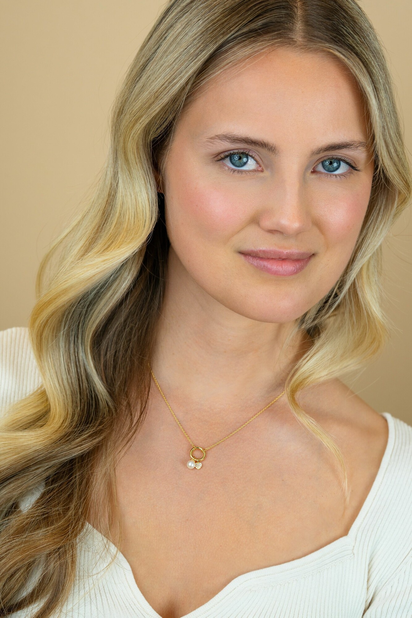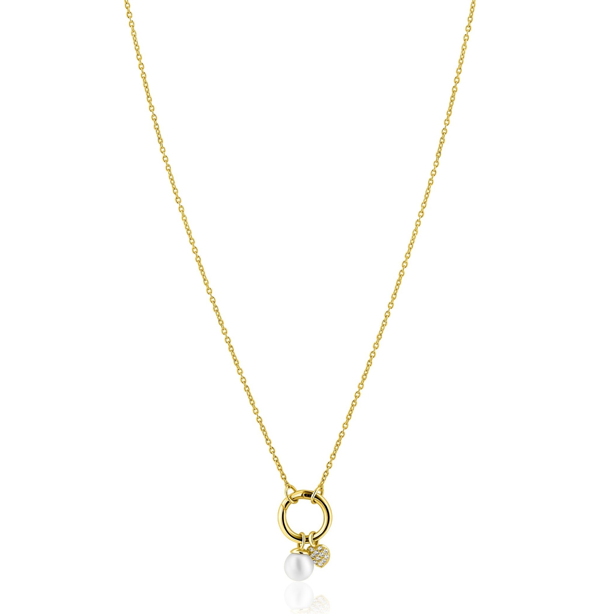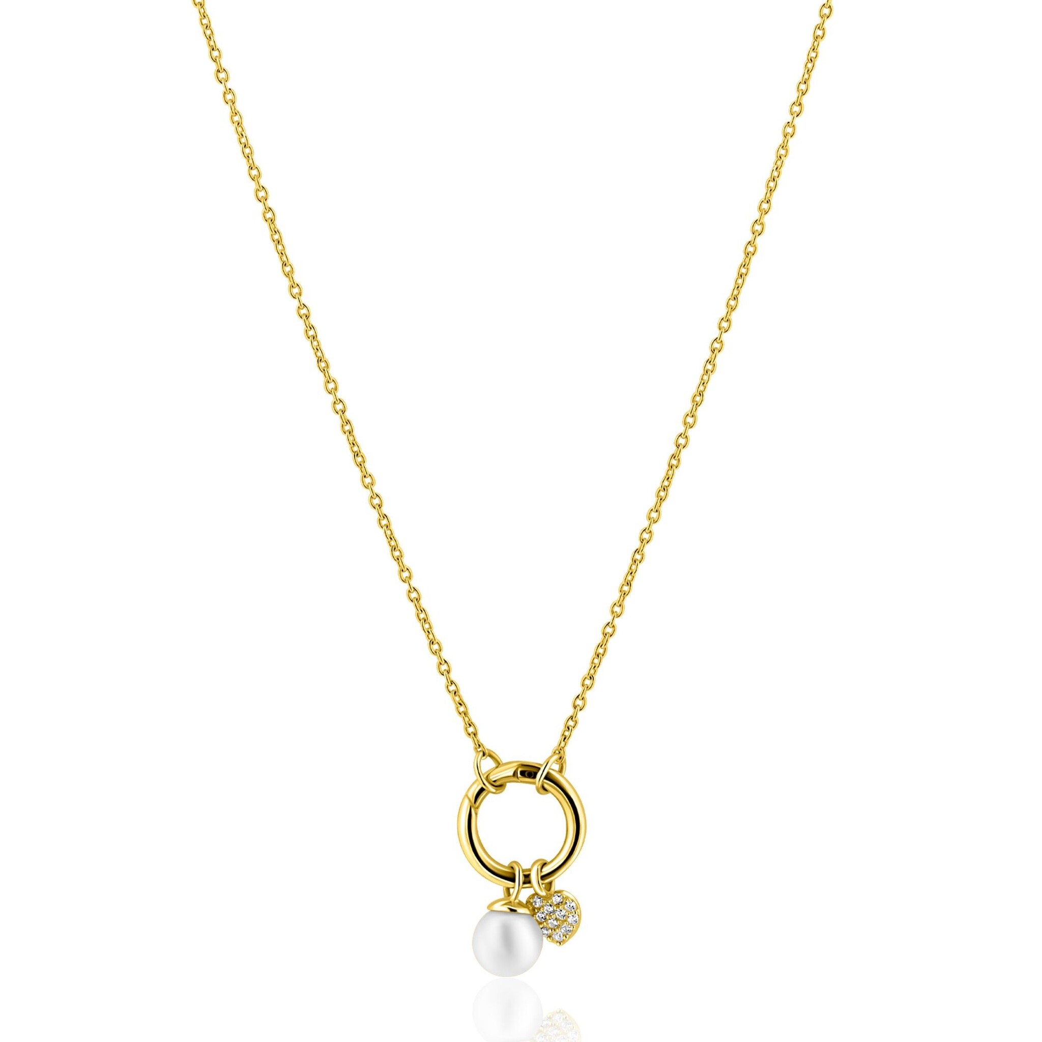ZINZI vergulde zilveren ketting met ronde sluitring en twee luxe bedels: een witte ronde zoetwaterparel en een vol bezet hartje. Door de te openen sluitring kunnen de bedels gewisseld worden. De lengte is te variëren tussen 42 en 45cm.